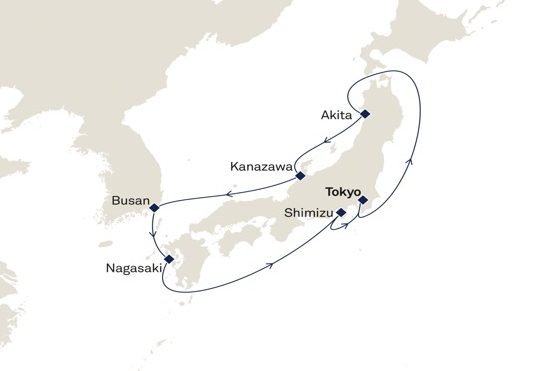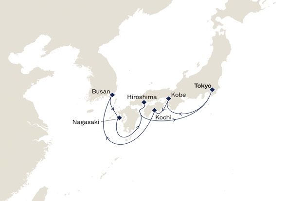 De rederij vaart 19 maal (tot en met 2025) vanuit Tokyo voor een 13-daagse Japancruise met ook een bezoek aan Busan in Zuid-Korea. Je ziet o.a. Kyoto, Hiroshima, Hakodate, Aomori. Vanaf €1696.