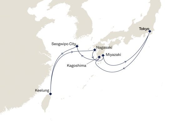 - 14 mei 2024: Zuidelijke eilanden – 11 dagen van Tokyo naar Kagoshima, Zuid-Korea (Seogwipo – Jeju Island), Taiwan (Keelung/Taipei), Japan (Nagasaki, Miyazaki – Aburatsu) – €1886