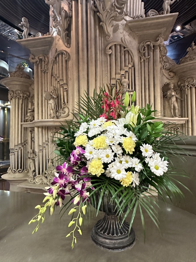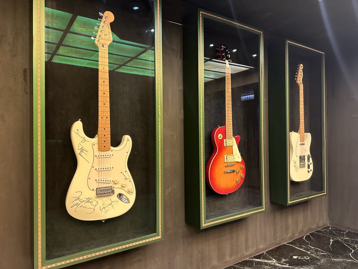 Voor liefhebbers van memorabilia hangen drie bijzondere gitaren, een beetje verstopt op dek 3: een gitaar met de handtekeningen van Queen (o.a. Freddie Mercury), eentje met handtekeningen van o.a. Eric Clapton, BB King en Keith Richards en eentje met de handtekeningen van de Rolling Stones. Een beetje merkwaardig is het grote orgel met 450 pijpen in het atrium dat een speciale kast heeft van 5 meter hoog. Ik heb het niet in werking gezien – en ik betwijfel of er de laatste jaren ooit op gespeeld is – , maar de beelden bewegen mee op de muziek als erop gespeeld wordt.