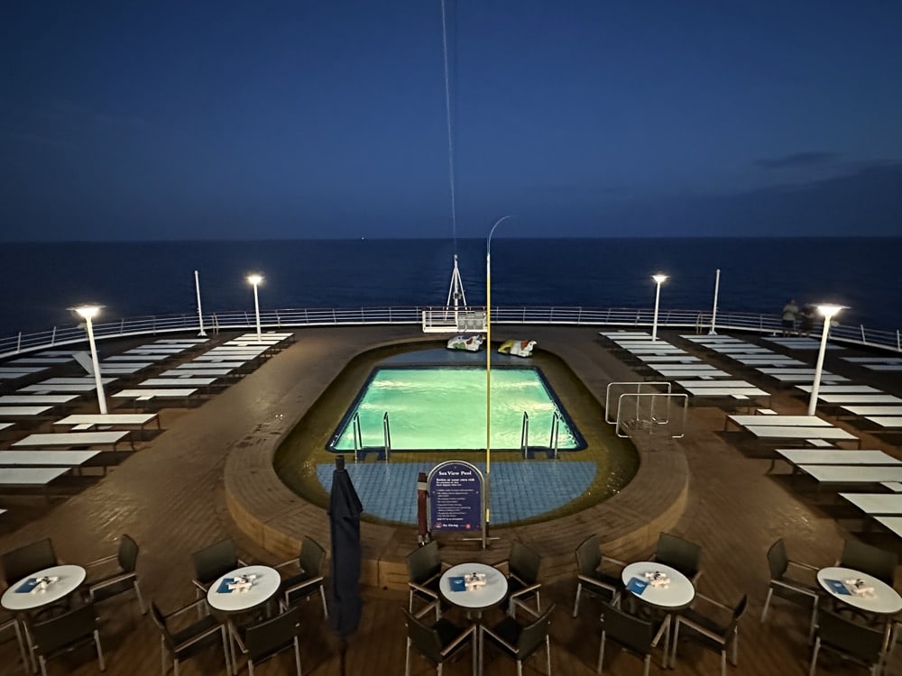 Loop je door het Lidorestaurant naar achterop het schip, dan ligt daar het achterzwembad te schitteren met enorm veel dekruimte en twee koeien die je aanstaren als je in het zwembad zwemt.