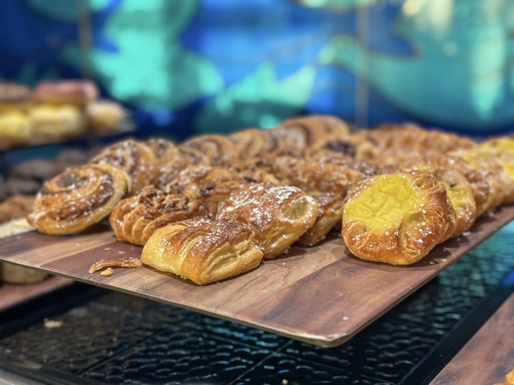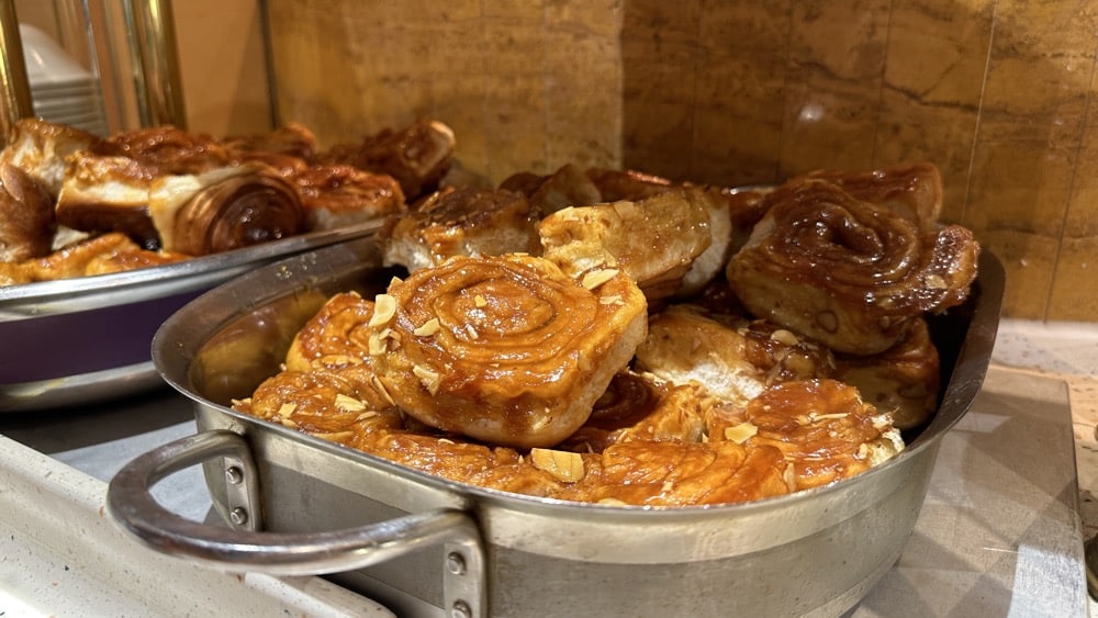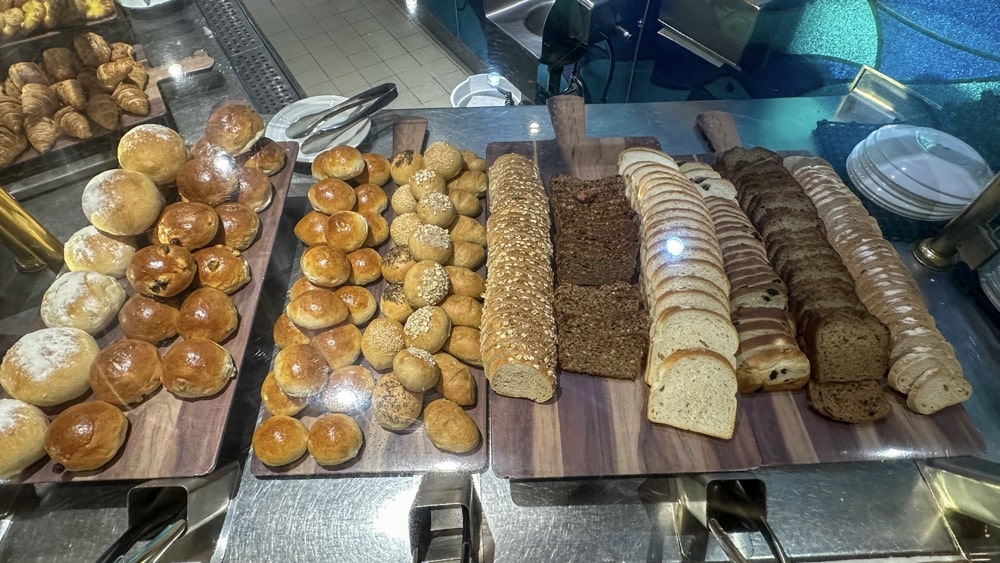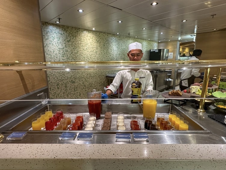 Het ontbijt in het Lido Market restaurant bestaat uit een brood gedeelte, met brood, witte bolletjes en andere lekkernijen. Daarnaast is er een omelet station en een wafel station. Bovendien kan je wat warmers halen, zoals bacon, ei en aardappelrosti’s. Tot slot is er een yoghurt station met fruit en muesli. Bij de koffie/thee buffet staan bovendien behoorlijk wat soorten cornflakes.