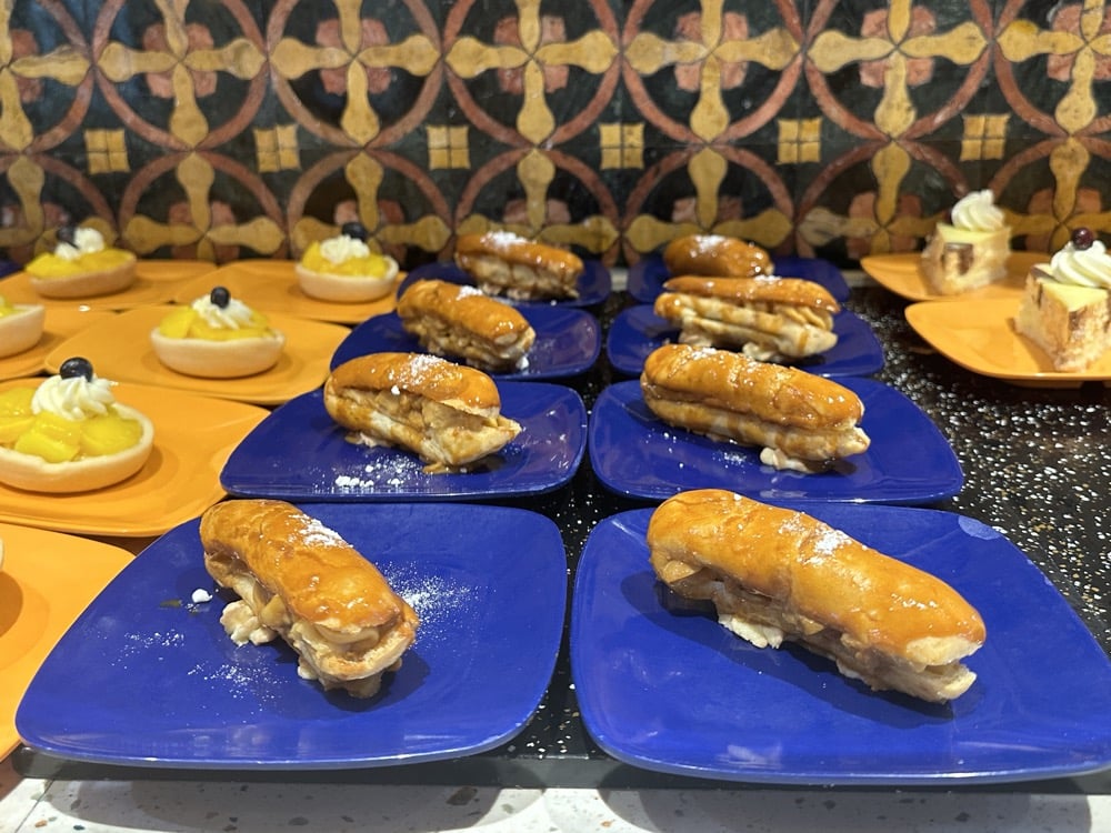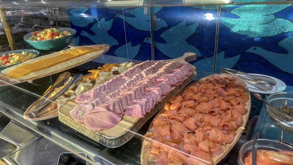 Het Lido Market restaurant is gelegen op dek 8 en omvat veel verschillende stations waar je eten kunt halen. In de meeste gevallen wordt het voedsel aangereikt, maar de broodjes en de desserts mag je bijvoorbeeld wel zelf pakken. Een impressie: