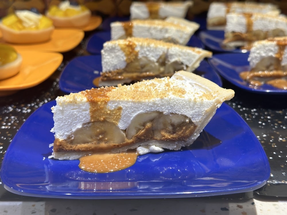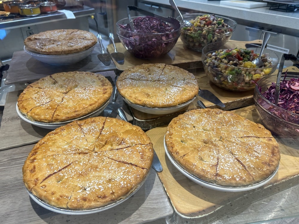 Bij lunches en diners zijn er bijvoorbeeld altijd pizza’s, sandwiches (lunch) en een saladebar, warme vlees gerechten en themastations zoals sushi of een lokale specialiteit. Een verrassing vond ik (maar op 1 dag te vinden) het pie station: met diverse soorten vlees pie, groente pie en appeltaart.