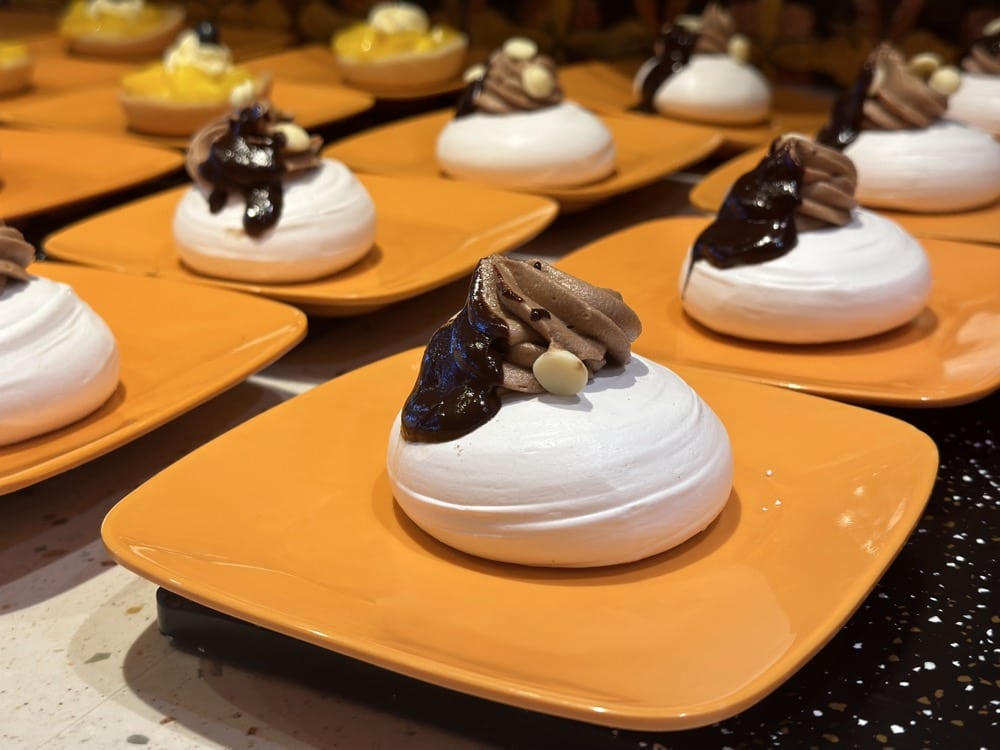 De desserts zien er overheerlijk uit, vooral de oranje en blauwe – de kleuren die je overal ziet terugkomen – bordjes maken het een smakelijk geheel.