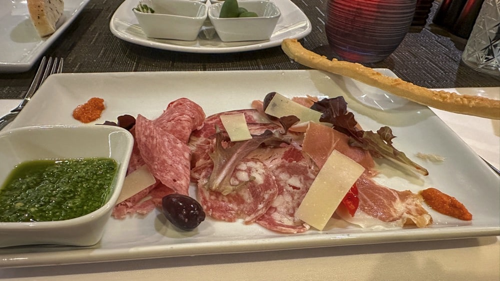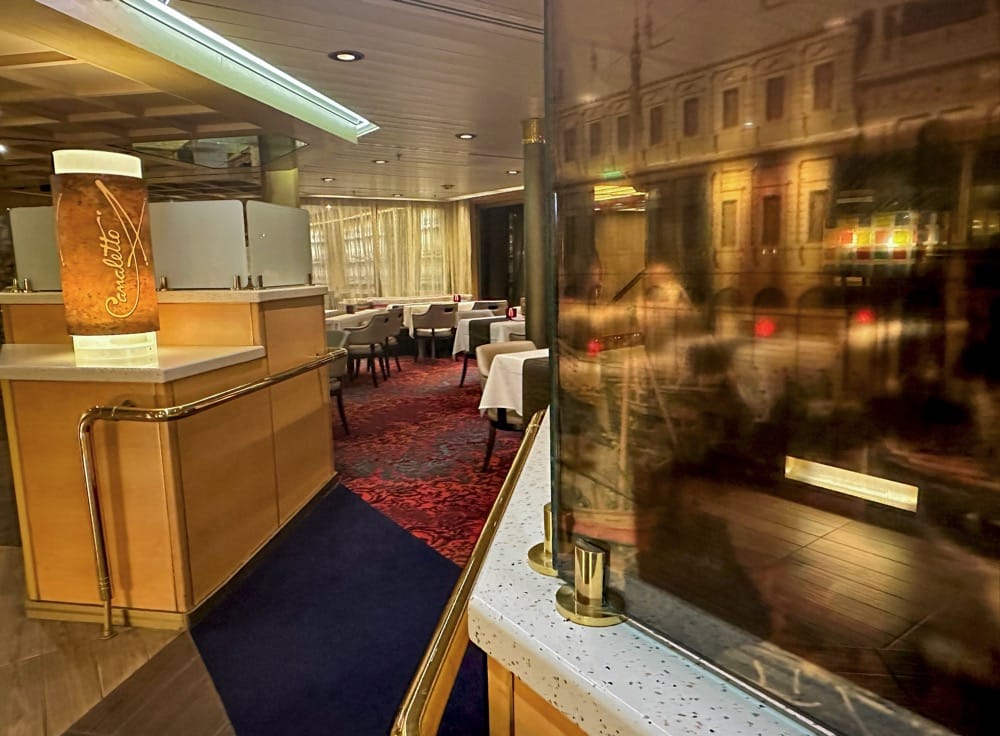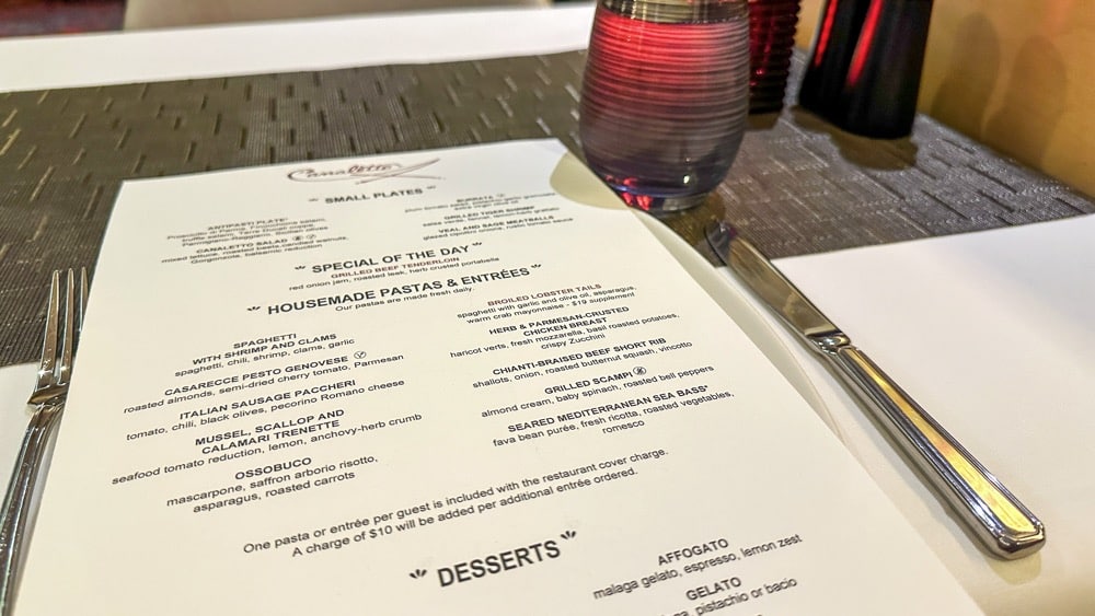 De andere zeedag ga ik naar Canaletto, dit is het Italiaanse restaurant dat in een afgescheiden gedeelte bij het Lido Market restaurant zit. Je betaalt 25 dollar toeslag per persoon.