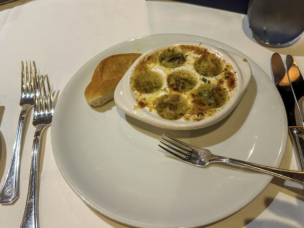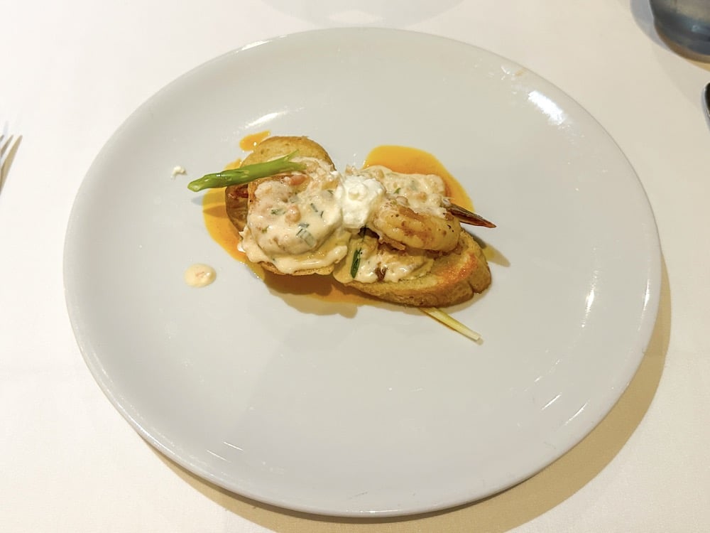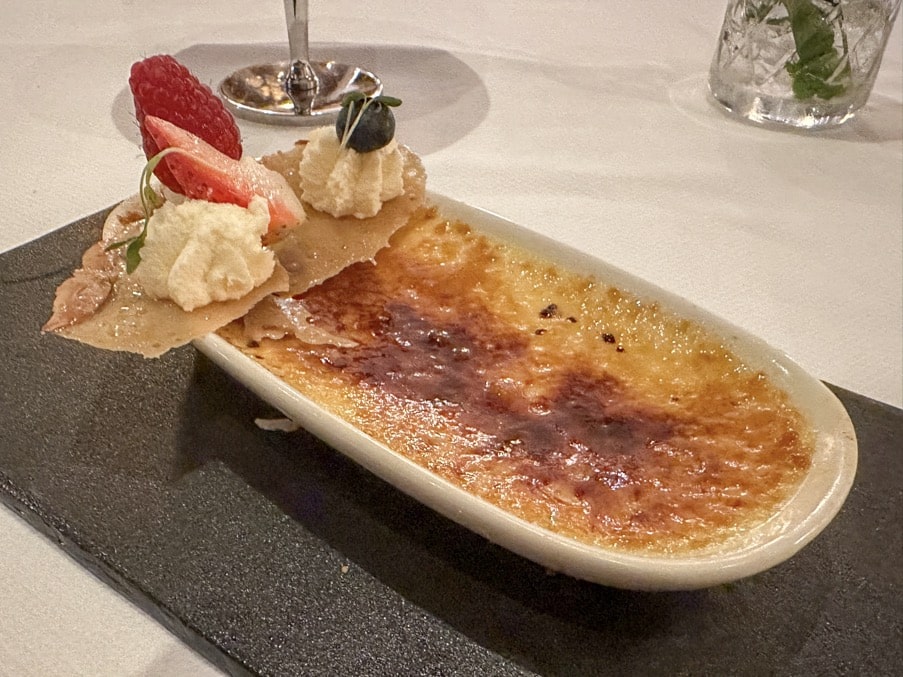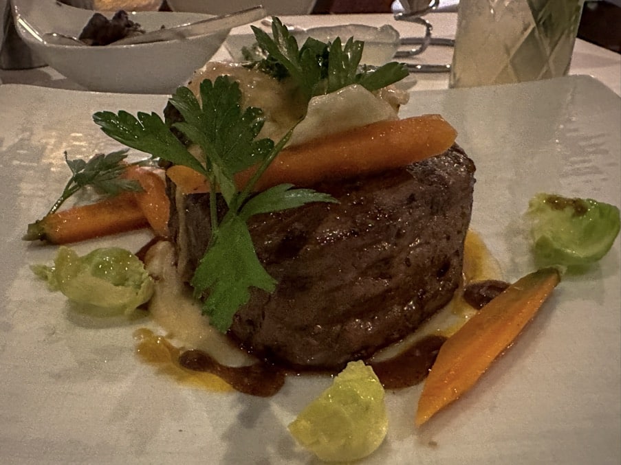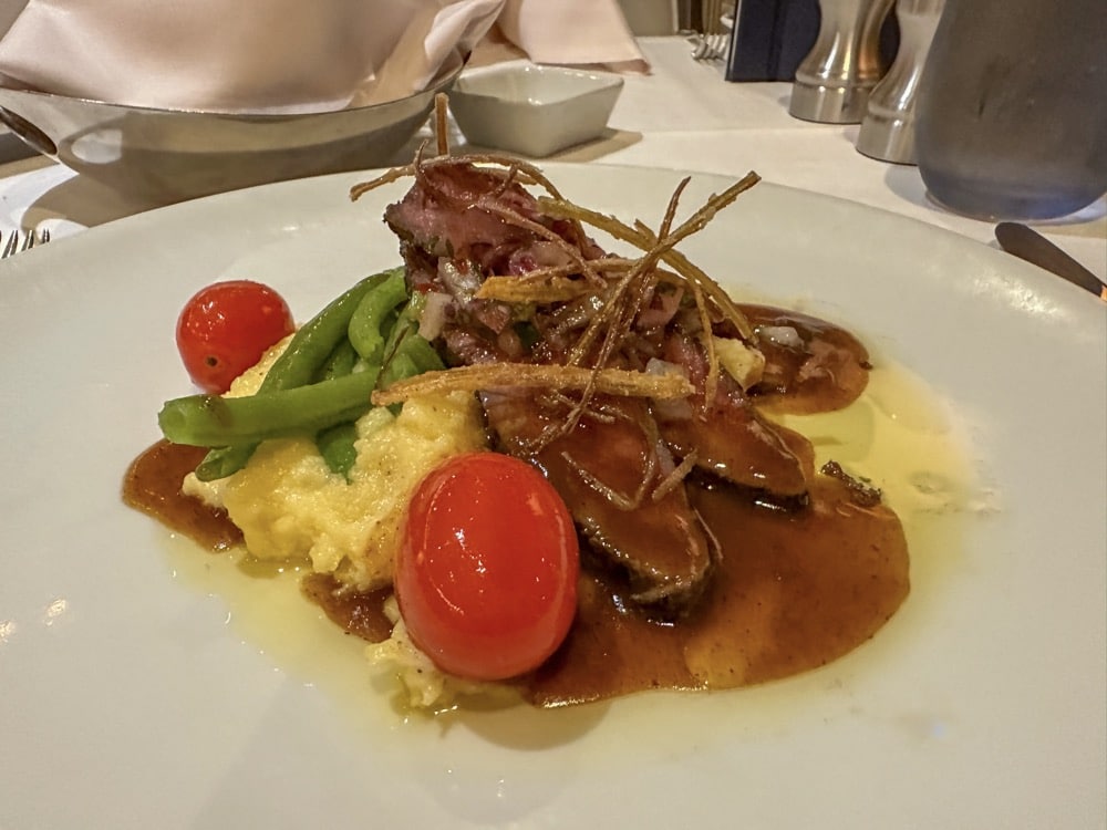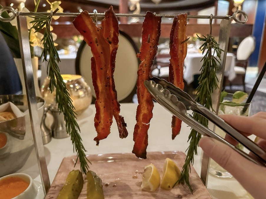 Op het menu staan onder andere gerechten van David Burke, lid van Holland America Line’s Culinary Council en vooral het voorgerecht verrast mij enorm. Overheerlijk 8 uur gemarineerd spek, Clothesline Candied Bacon, geserveerd aan een rekje! De bacon heeft minimaal 8 uur in een marinade van Maple siroop, mosterd, sinaasappelschil en peper gelegen en dat zorgt voor een overheerlijke smaakbeleving. Als hoofdgerecht heb ik de mooie steak met kreeft dumplings, ook van David Burke. Een krakende crème brûlée sluit mijn avond af.