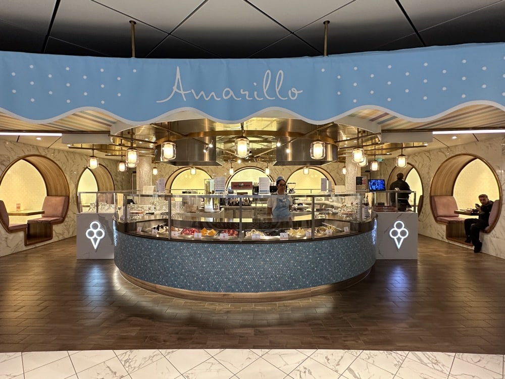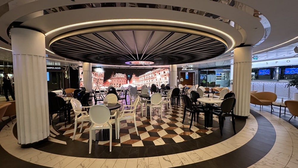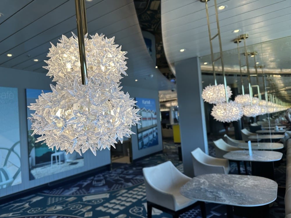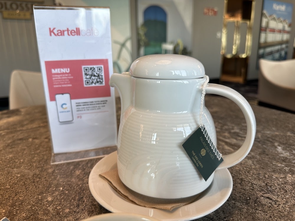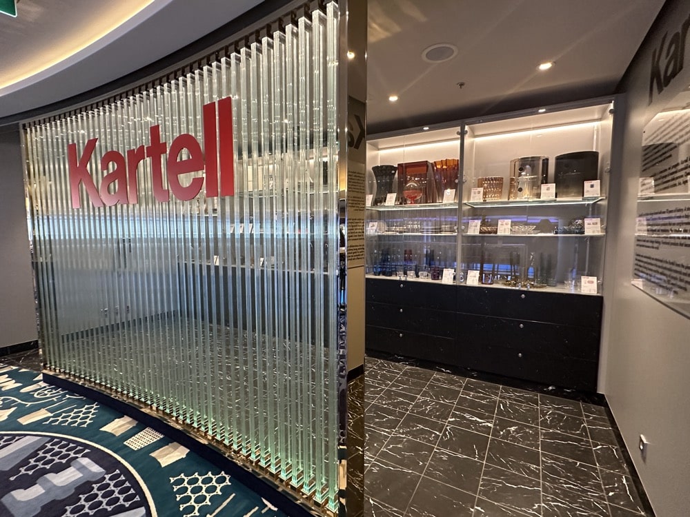 De leukste plek om koffie of thee te drinken vind ik Kartell Cafe, dat gelegen is rondom het ronde Colosseum theater op dek 8. Kartell is een Italiaans design merk van onder andere servies. In het buffetrestaurant en hoofdrestaurants wordt bijvoorbeeld glaswerk van Kartell gebruikt. Je kunt zelfs aan boord een keuze maken uit een aantal artikelen die tentoongesteld staan bij het café.