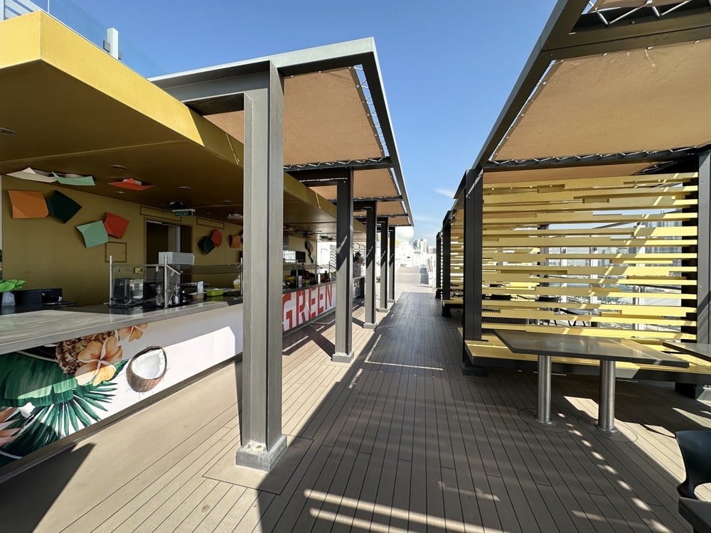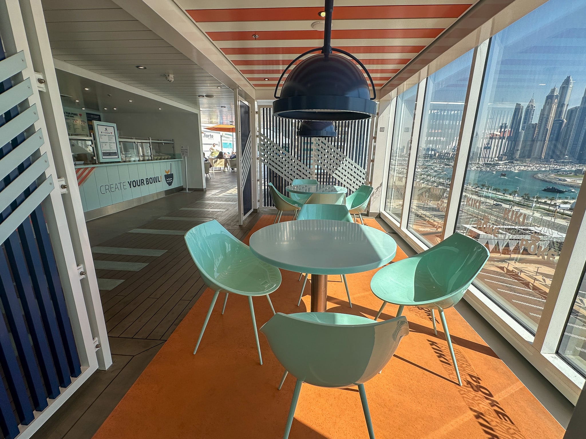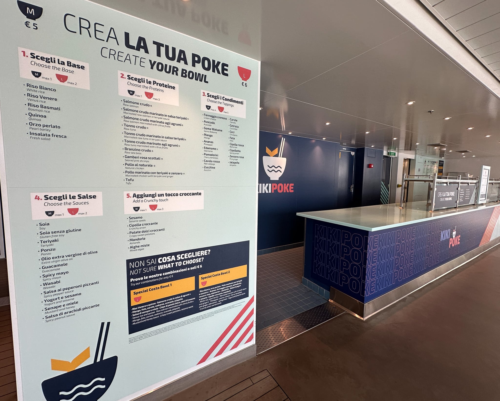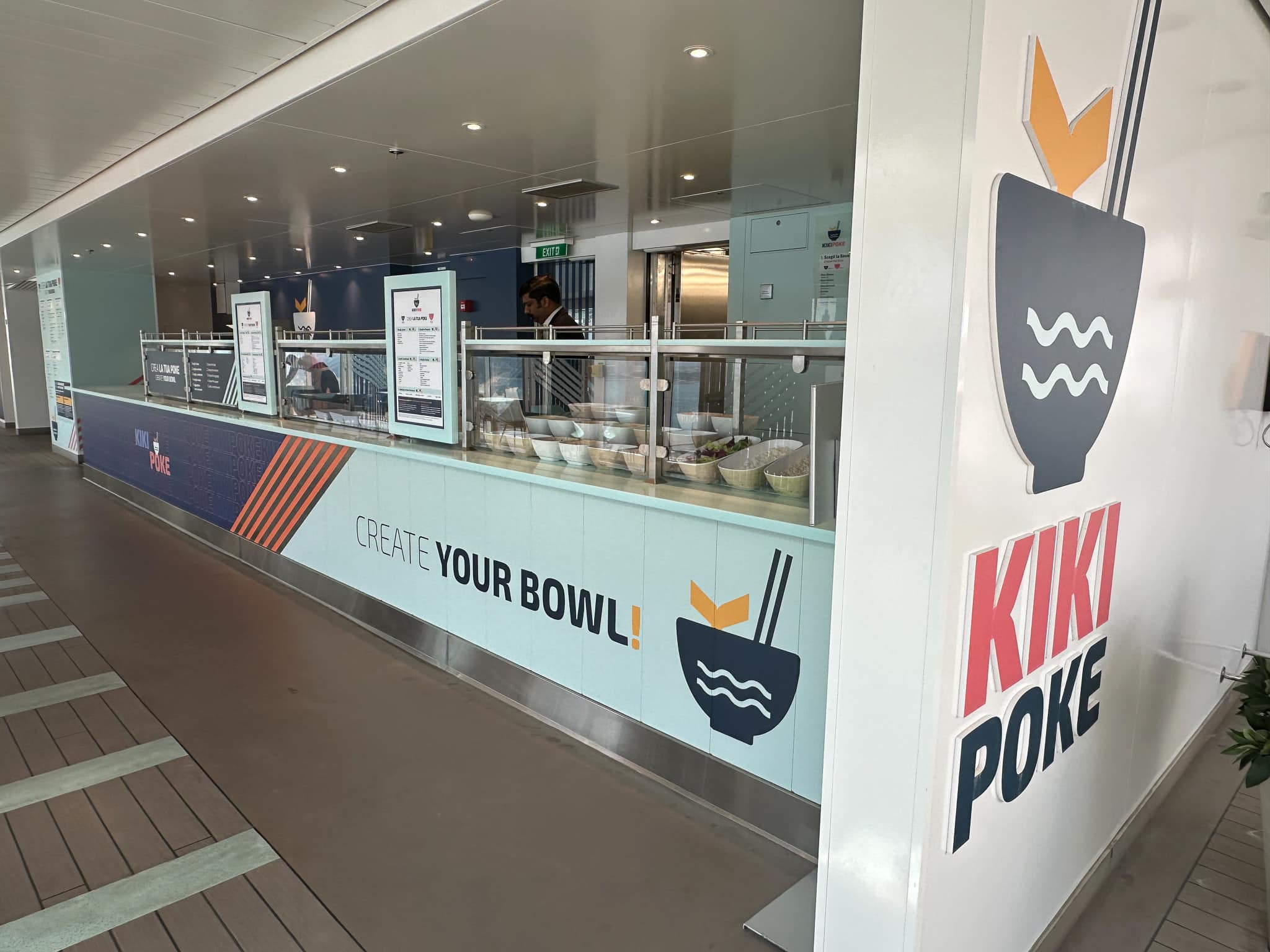 Een erg leuk restaurant aan de zijkant van het schip (bakboord) waar een aantal zitjes zijn. Je kunt zelf je pokebowl samenstellen met ingrediënten die voor je opgeschept worden in de bowl. Je zit overigens altijd uit de wind hier, met dichte ramen aan de zijkanten.