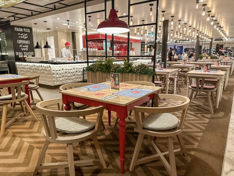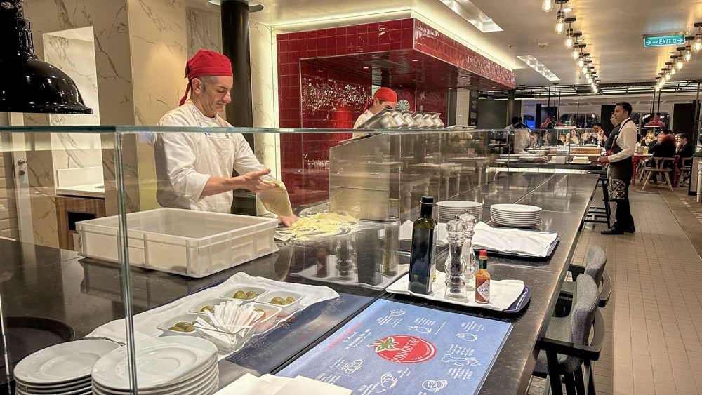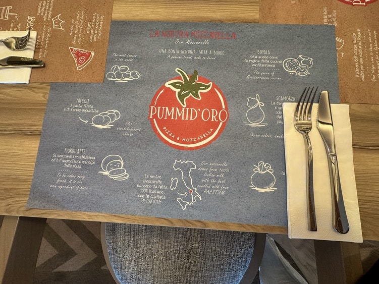 De beste plek om pizza te eten aan boord van dit Costa schip is de Pizzeria Pummid’oro; een pizzeria restaurant dat een leuke sfeer heeft en waar je kunt zien hoe je pizza live gemaakt wordt. Ik geeft je wel graag een tip: wanneer je lid bent van het vaste-gasten programma van de rederij, ontvang je behoorlijk wat korting! Zo is de goedkoopste pizza slechts €6,75 in plaats van €9,00.