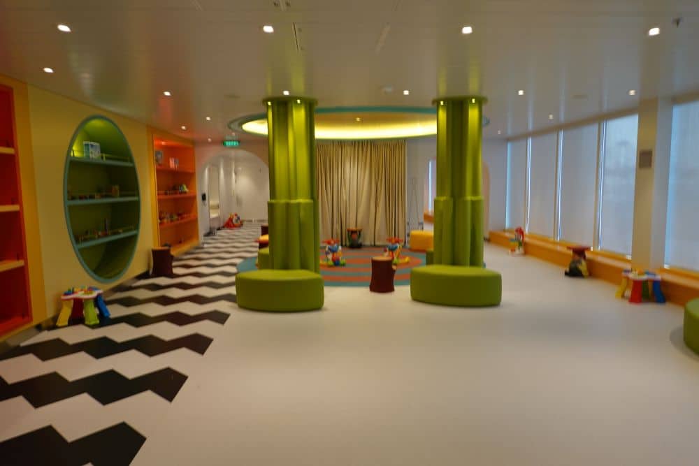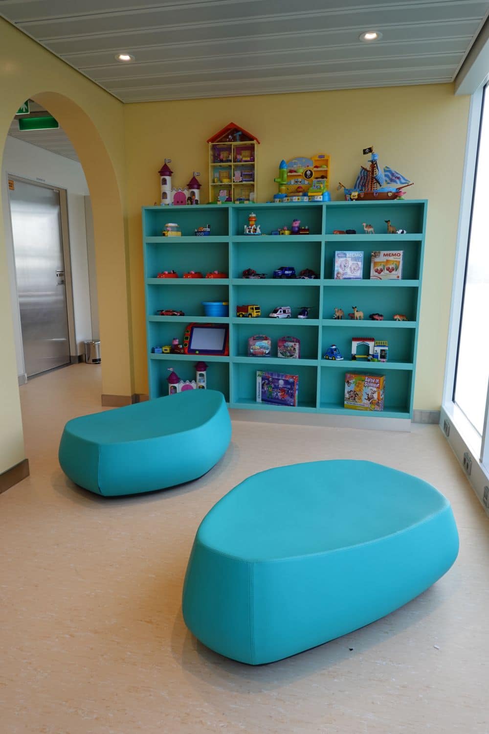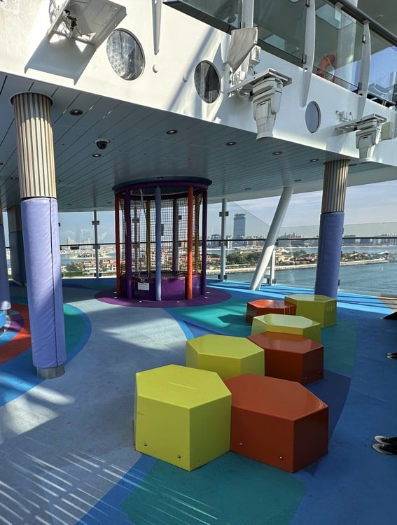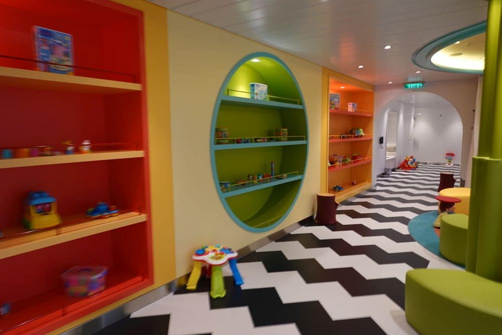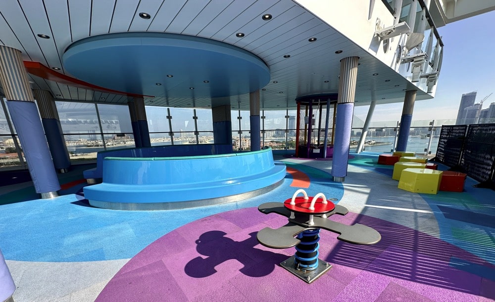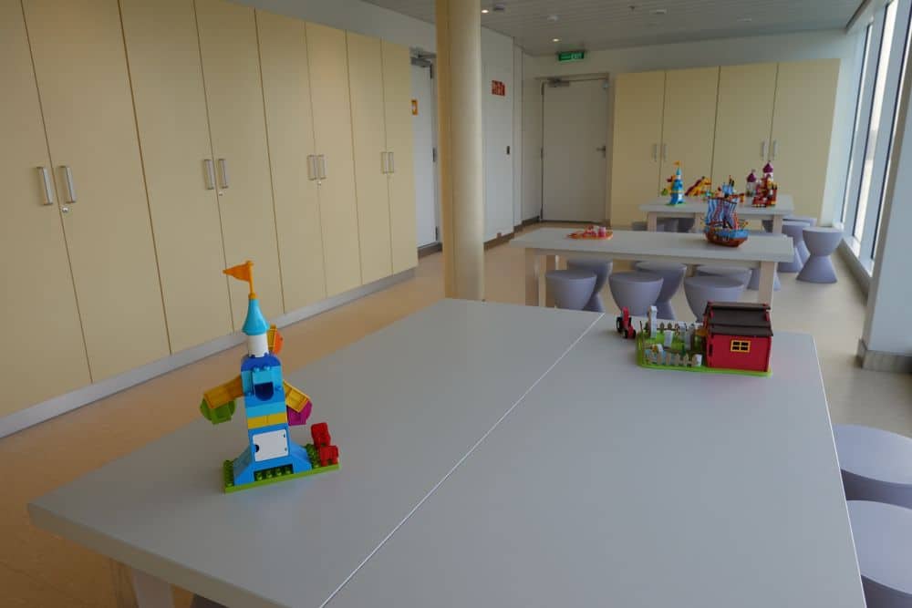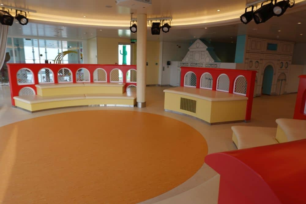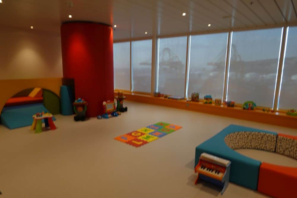 Een kleine speeltuin waar de jongsten zich even kunnen uitleven ligt ook op dek 16, achteraan. Bij het grote beeldscherm daar bevindt zich aan stuurboordkant een overdekte speelplaats. Fijn is dat er ook ruimte is voor ouders om te zitten! Je vindt er een trampoline, wat blokken om op te klimmen en een wip.