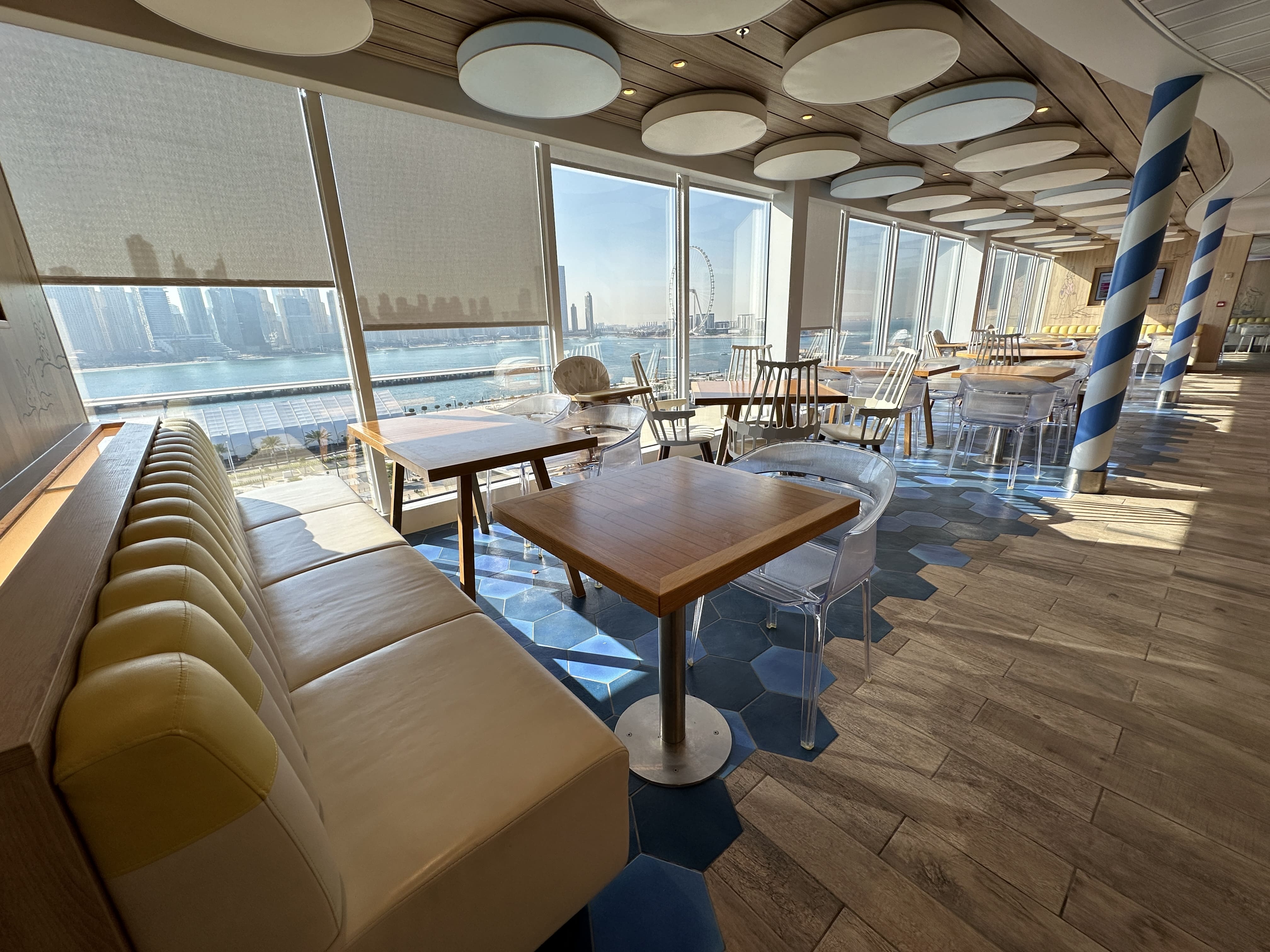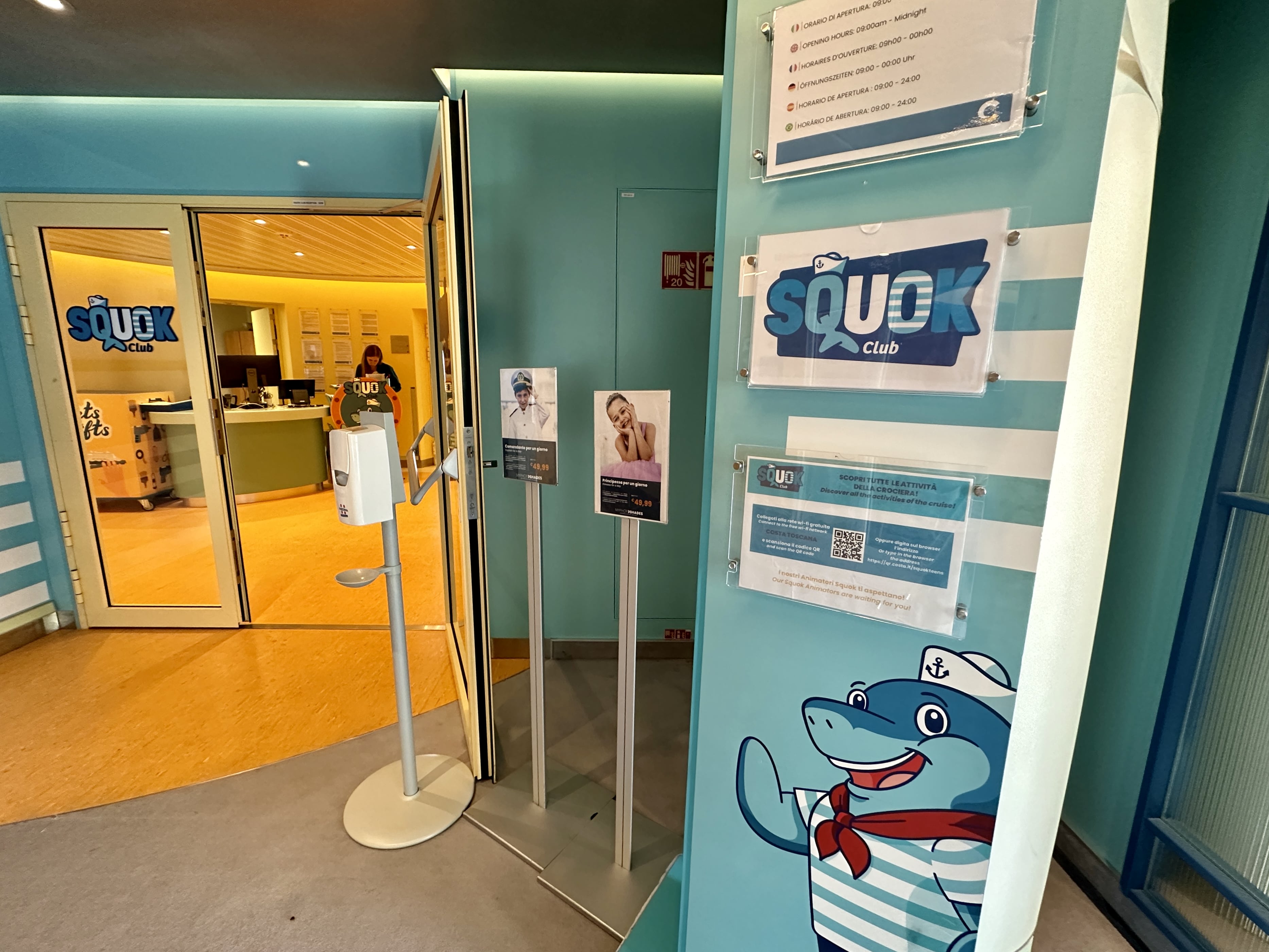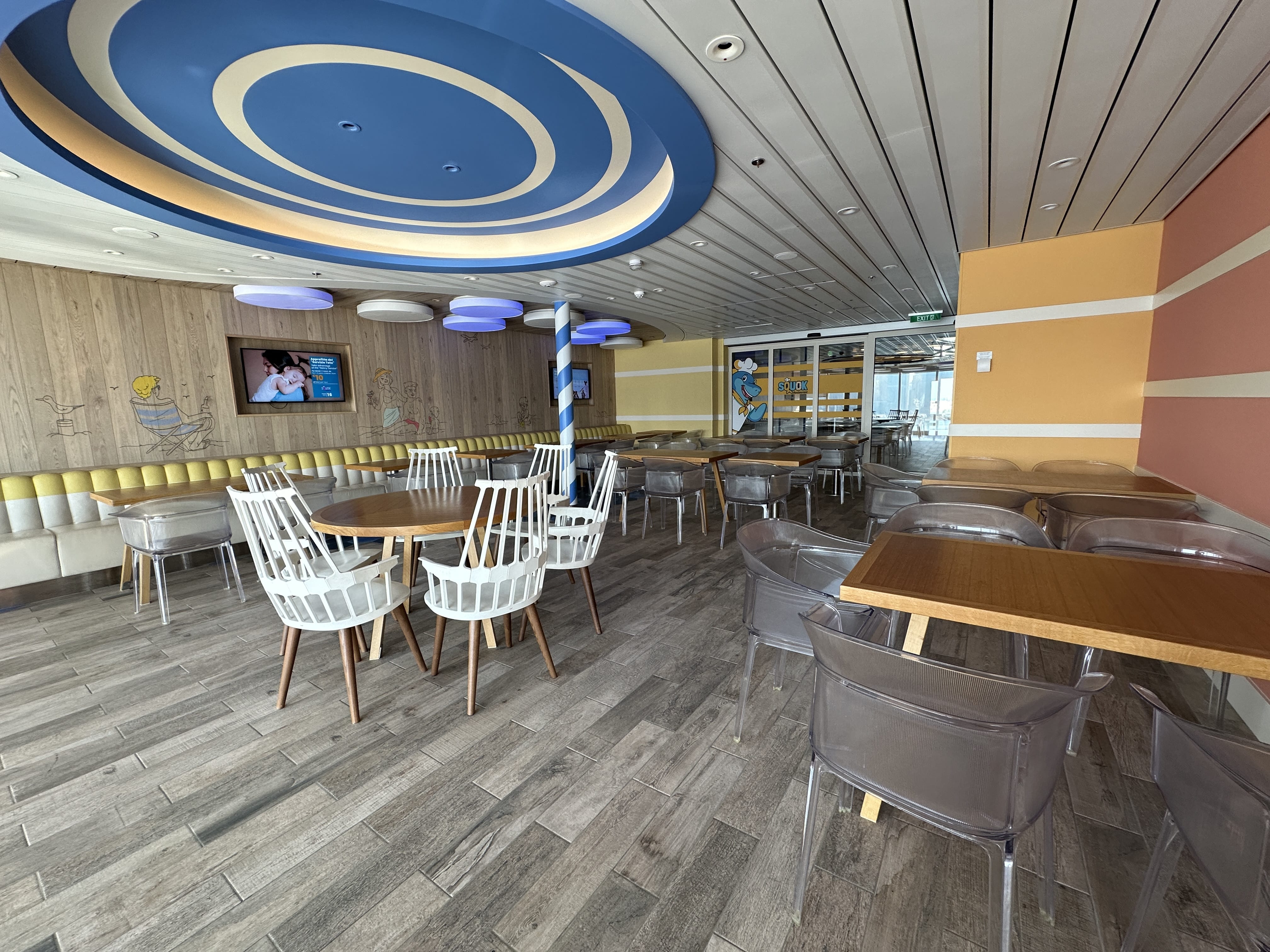 Handig aan de overkant gelegen van de kinderclubs, ligt buffet kinderrestaurant Squok. Je vindt hier in een kleinschalige setting een buffet voor ontbijt, lunch en diner. Er zijn een aantal fijne familietafels – maar ook wat voor families onhandige tweepersoons tafels. Babystoelen zijn in ruime mate voorhanden. Uiteraard is het menu aangepast aan wat kinderen lekker vinden. De ingang van het restaurant bereik je via het buitendek. Hieronder een impressie: