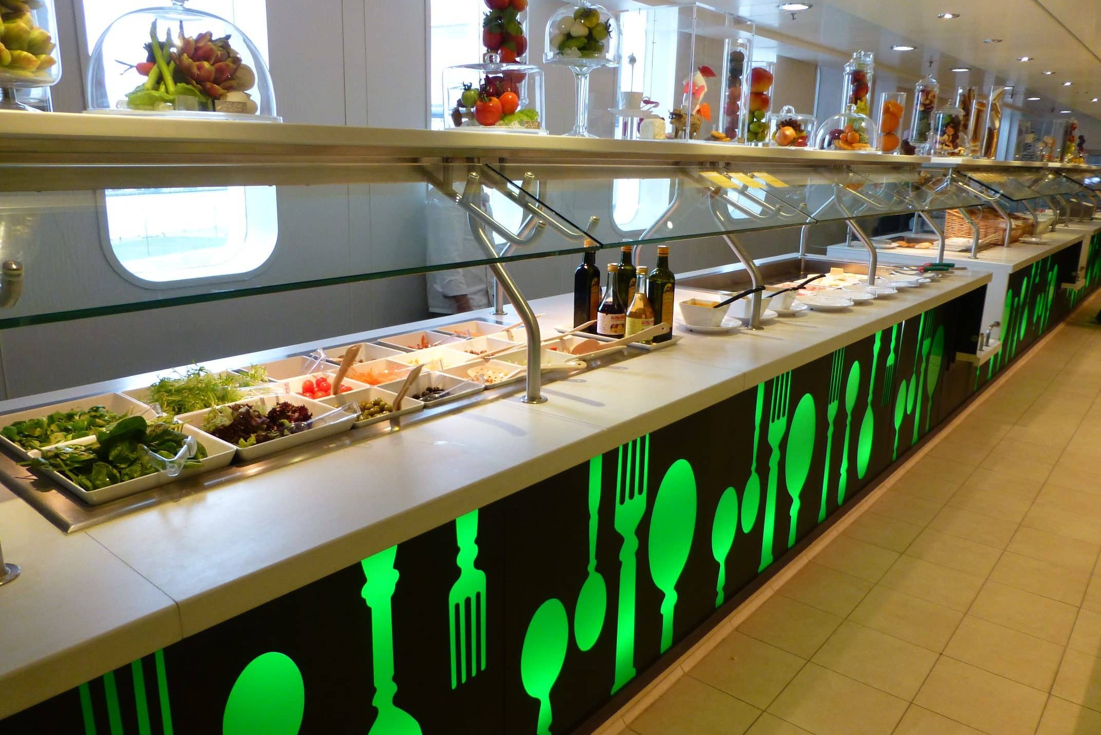 Op traditionele cruiseschepen zijn er minimaal twee restaurants; een buffetrestaurant en een a la carte restaurant.  In het buffetrestaurant staan of de gerechten klaar om op te scheppen of de medewerkers van achter het buffet scheppen het gewenste diner op. Er is vrijwel altijd erg veel keuze. Je zoekt vervolgens een plekje om je diner op te smikkelen. Het voordeel is uiteraard dat je snel je maaltijd hebt, maar het kan soms ook druk zijn op bepaalde tijdstippen in het buffetrestaurant zodat je moeilijk een vrije tafel vindt. Probeer dus altijd eerst een tafel te vinden en haal daarna je diner.