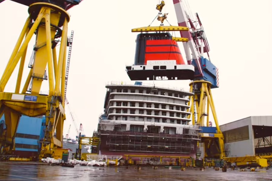 Op vrijdag 14 april 2023 was het tijd voor een nieuwe mijlpaal in de bouw van Queen Anne: het schip ontving namelijk haar iconische rood-zwarte schoorsteen. Dit herkenningselement siert de schepen van Cunard al meer dan 150 jaar. De kroon van Queen Anne is geplaatst!