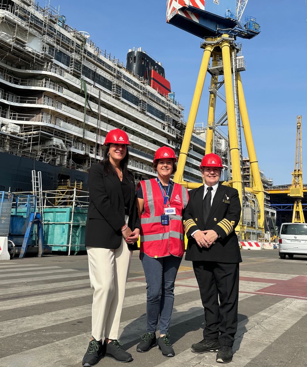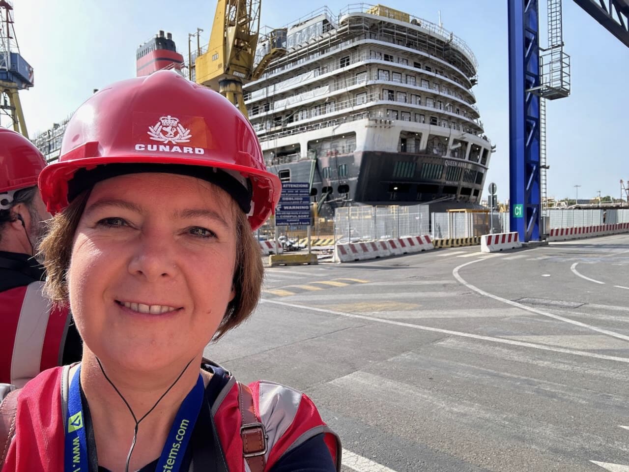 Miriam werd in oktober 2023 uitgenodigd om een half jaar voor haar oplevering in de Fincantieri scheepswerf in Marghera, bij Venetië, aan boord te gaan van de Queen Anne. Samen met kapitein Inger Thorhauge en president van Cunard, Katie McAlister, ging ze op pad door het schip. (Lees hier hoe de Queen Anne er op dat moment uit zag).