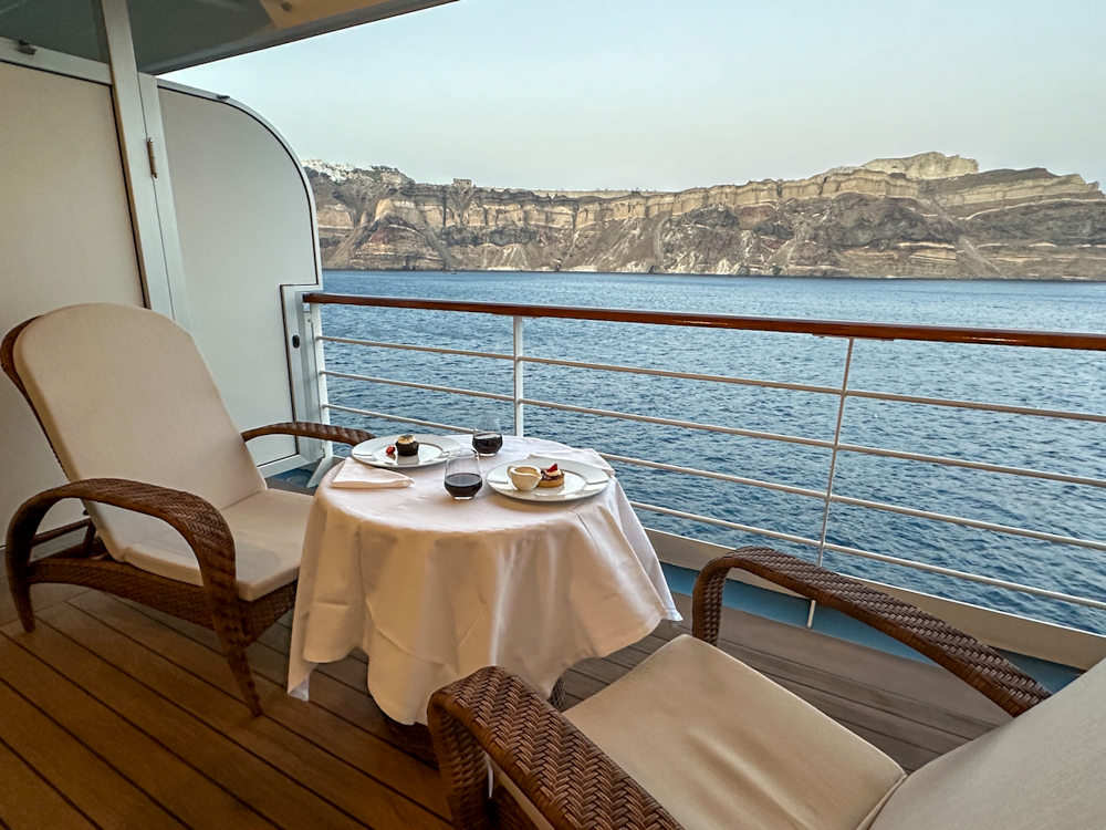 Het ruime balkon nodigt erg uit om daar je ontbijt te hebben, in ons geval vaak gebracht door Bobby. Het diner hebben we ook een keer op het balkon genuttigd, met uitzicht op Santorini. Magisch!