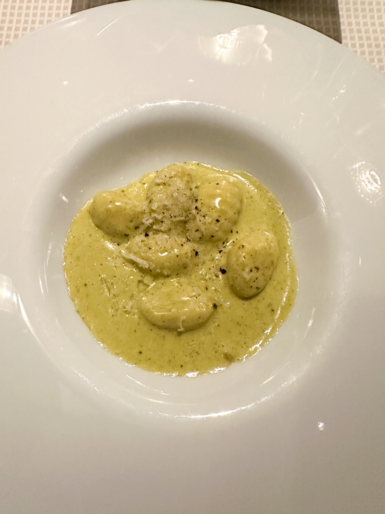 De voorgerechten komen standaard op tafel waaronder groentechips, bruschetta, olijven en brood. Je mag vervolgens een salade van het buffet uitkiezen. Het tussengerecht, typisch Italiaans, is bijvoorbeeld een pasta, maar dan in een wat kleinere portie. Ik nam een overheerlijke romige gnocchi. De hoofdgerechten kies je van de menukaart en worden in een open keuken verderop bereid. Loop er zeker even naar toe om te zien hoe dat functioneert. De desserts mag je van het buffet nemen of je bestelt een overheerlijk ander dessert.