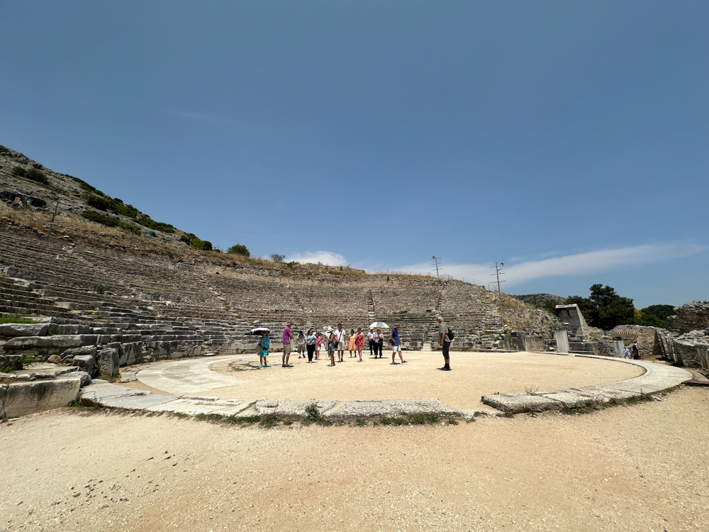 Wij hebben ingeschreven voor een excursie naar een historische site bij Kavala. Doordat we zijn ingedeeld voor de middag excursie, doen we het een paar uurtjes rustig aan op het schip bij het zwembad. Het is genieten daar! Na een lunch bij het ernaast gelegen poolgrill, pakken we onze spullen om naar het theater te lopen. Dit is de verzamelplaats voor alle excursies.