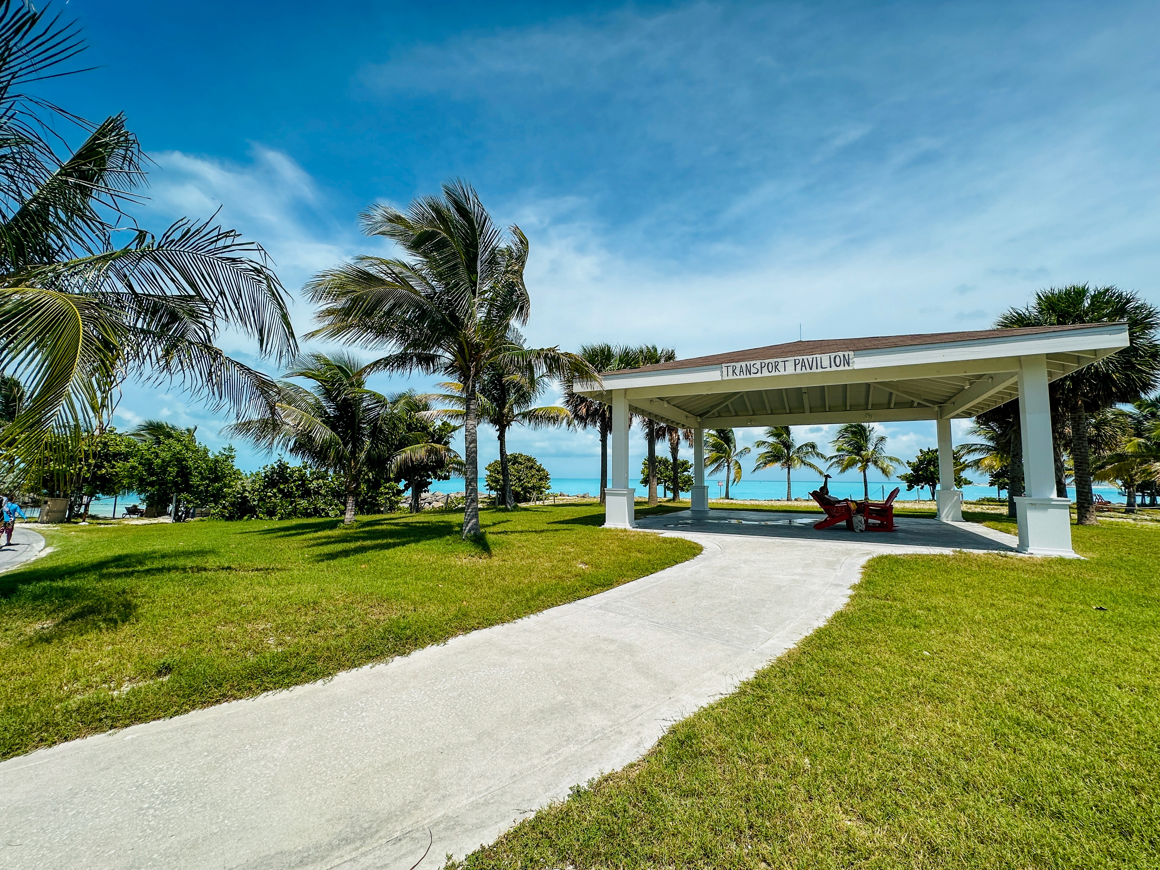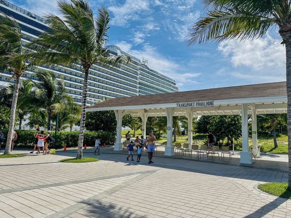 Op het eerste plein, met de blauwe en rode vuurtoren, staat aan de linkerkant de eerste halte voor het vervoer. Op het eiland word je namelijk met grote golfkarren naar diverse plekken gebracht. Per wagentje zijn vijf banken beschikbaar, dus reken op zo’n 20 personen die mee kunnen. Het is reuze gezellig aan boord door de chauffeurs, die – vooral op de terugweg – de sfeer erin brengen met liedjes. De haltes waar je uitstapt, en later ook kunt instappen, zijn allemaal voorzien van een dak (schaduw!) en stoelen. Ook staan er 1 of meerdere strandrolstoelen bij deze haltes, die mindervalide gasten kunnen gebruiken en zo makkelijker door het zand kunnen rijden.