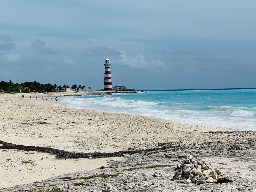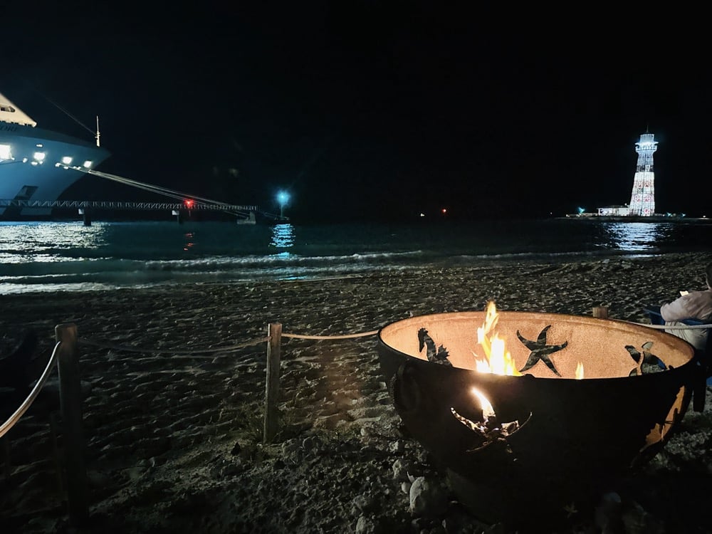 Bij de vuurtoren ligt een iets afgeschermd strand met uitzicht op je schip. Dit is het gemakkelijkst bereikbare strand, want je kunt met een wandelpad vanaf het welkomstplein er gemakkelijk naar toe lopen. Je vindt er een bar en verderop in de vuurtoren een terras waar je heerlijk kunt zitten. Op dit strand heb je overigens in de avond als het donker is, een tof uitzicht op de lichtshow van de vuurtoren. Er staan dan gezellige vuurkorven en je kunt op de vele houten strandstoelen plek nemen.