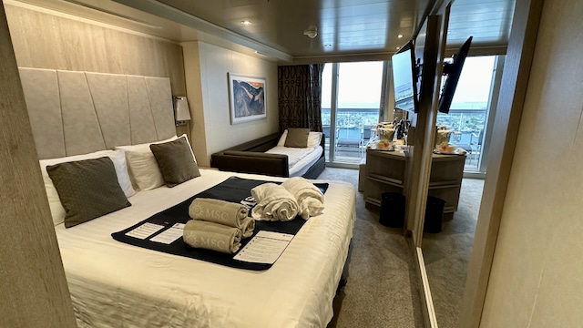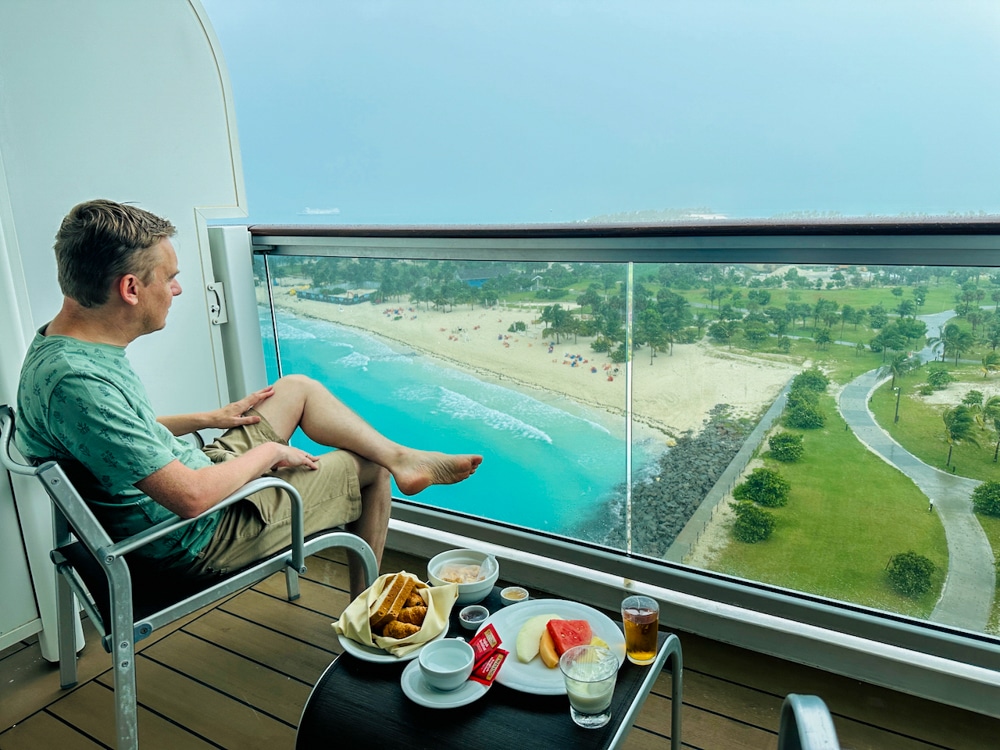 Voor de eerste maal in onze MSC ervaring, verblijven we een week in een balkonhut met een Aurea pakket. Onze balkonhut ligt op dek 14, nummer 072, aan de stuurboordzijde van het schip (in vaarrichting aan de rechterkant) en redelijk naar voren. Zo kunnen we zelfs in de verte zien wat er op de brug gebeurt! Echt een heerlijke plek om te genieten van de zee en ook van Ocean Cay, want de MSC Seashore lag aan haar stuurboordzijde aan de wal.
