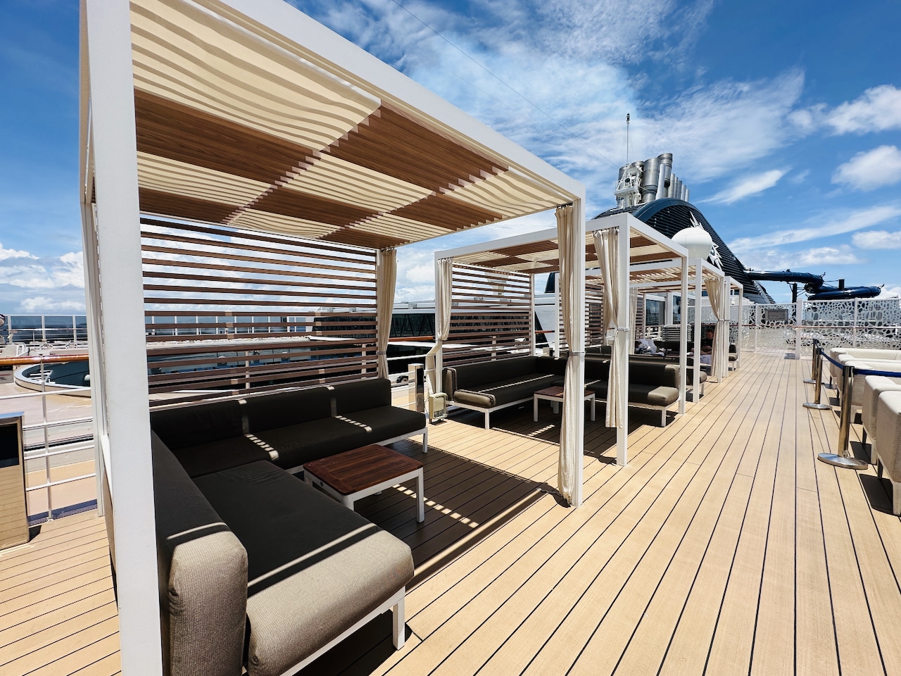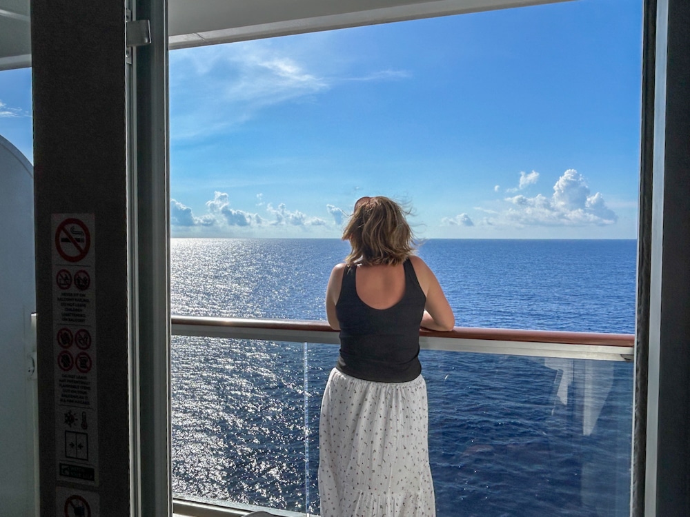 Deze balkonhut heeft een aardig groot balkon op een mooie positie. Twee stoelen en een tafeltje staan voor je klaar. Er zitten nog een aantal dekken met balkons bóven ons en dus geen grote overhang. Een mooie plek dus, zonder geluidsoverlast van een dek boven ons of onder ons.