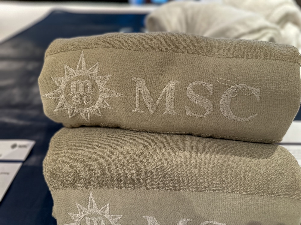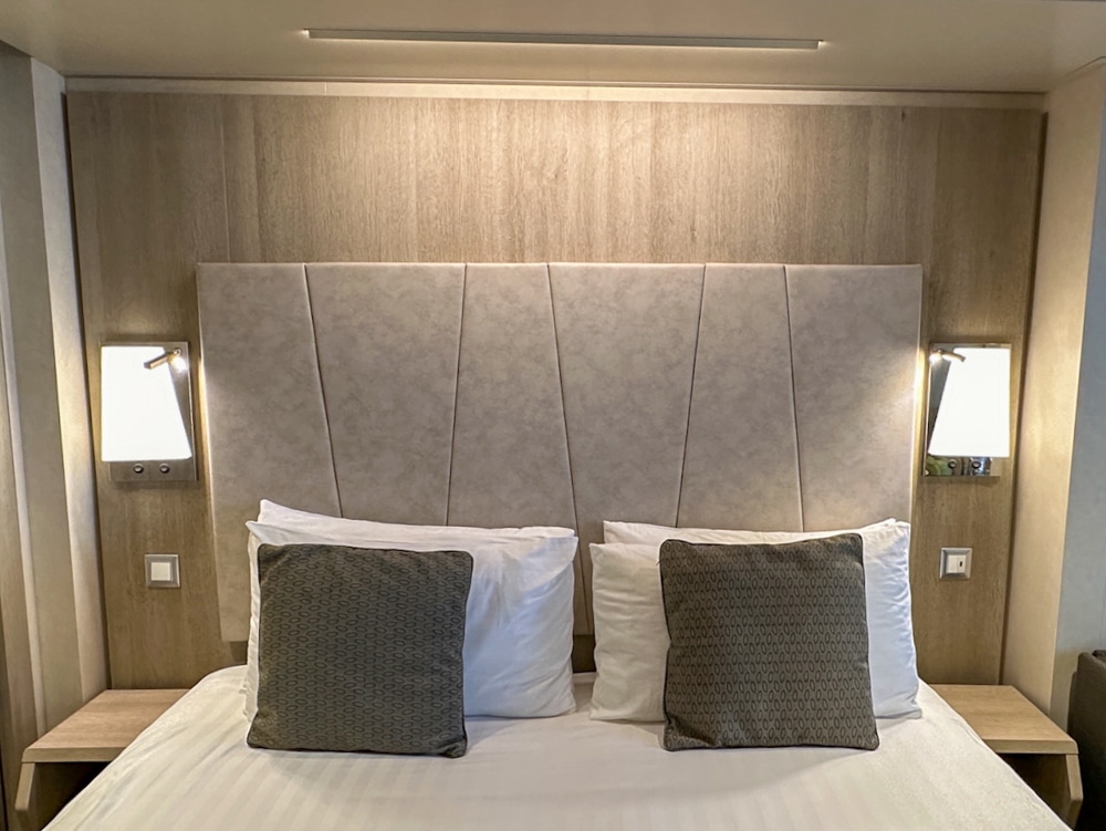 Bij het bed heb je aan elke zijde twee lampen. Een usb oplaadpunt zit aan de rechterkant. In elke hut ontvang je strandlakens van MSC, die je na gebruik weer kunt laten omwisselen voor schone strandlakens door je kamersteward. Vanwege de Aurea experience ontvingen we ook badjassen.
