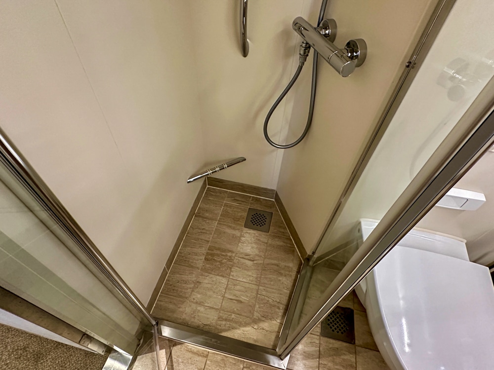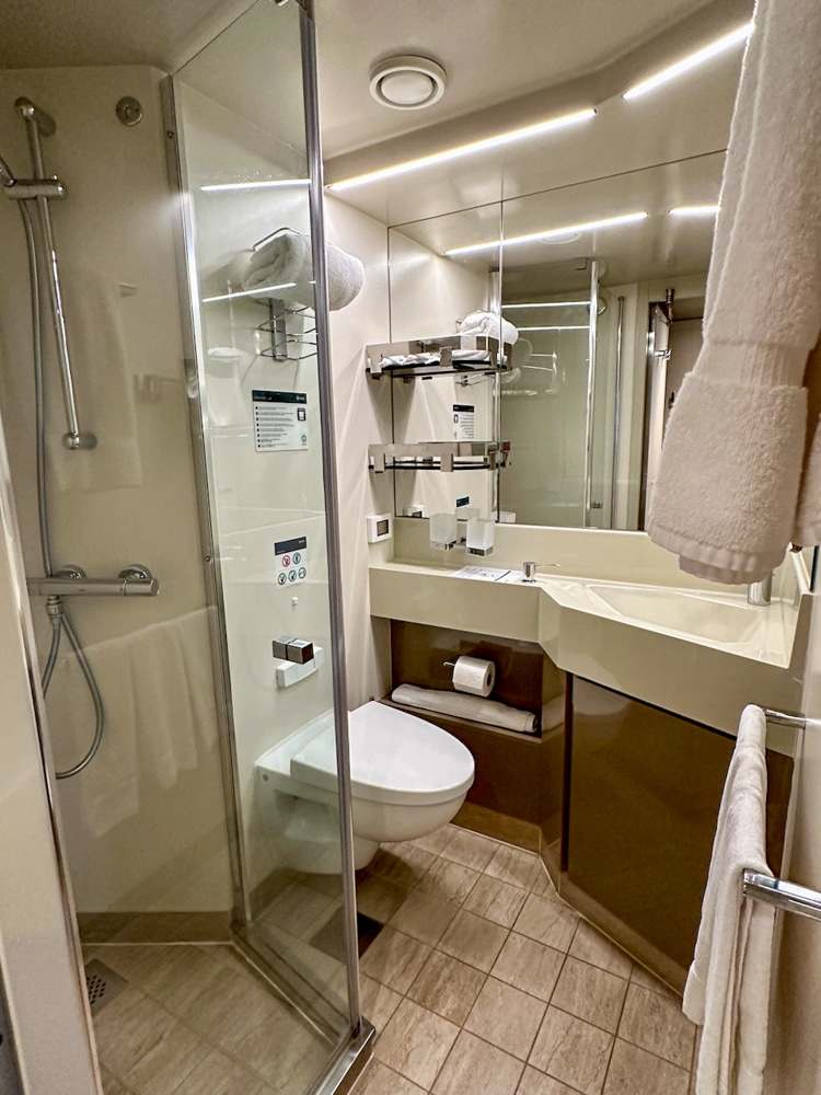 In deze balkonhut verbleven we met 3 personen. Bij binnenkomst heb je direct de badkamer, die functioneel is ingericht. Zeep komt uit een dispenser naast de wasbak. Je hebt twee plankjes die je kunt gebruiken voor je toiletspullen. Verder is er een make up spiegel en een stopcontact voor scheerapparaten. De föhn ligt in een la van het bureau. De douche cabine is niet heel groot, wel afsluitbaar met een deur. Aan de wand hangen shower gel en shampoo.