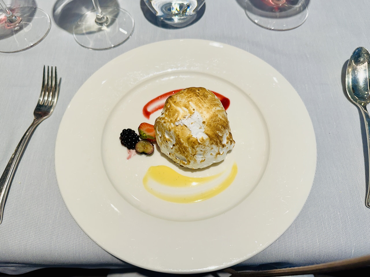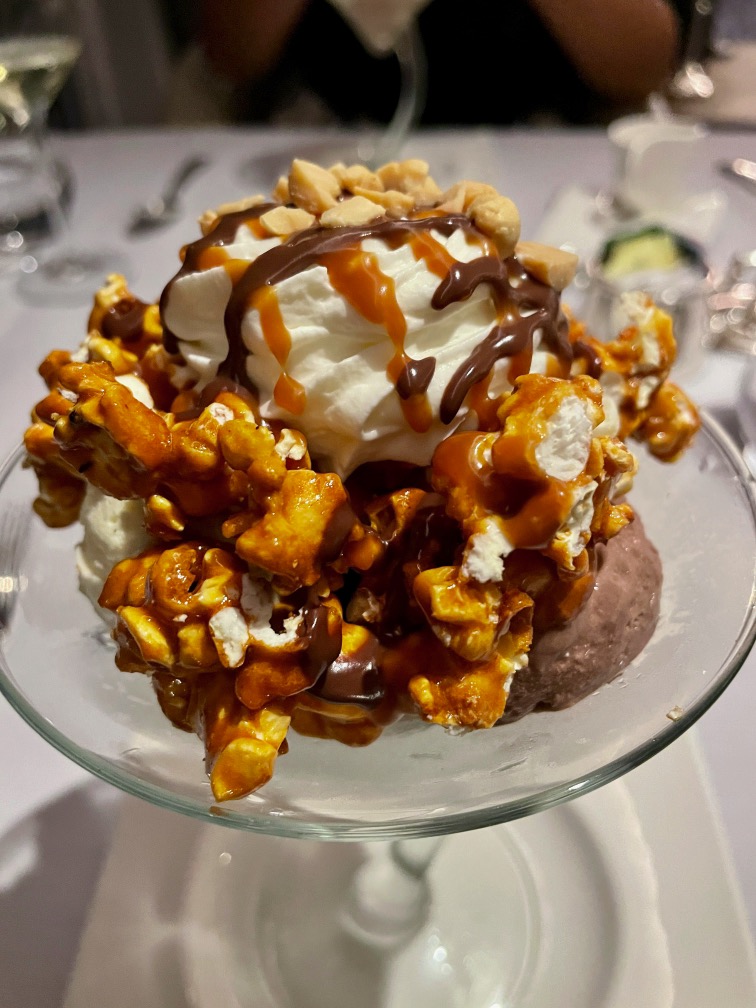 Het dessert, een Baked Alaska, is afkomstig van de menukaart van hoofdrestaurant Compass Rose, dat opvalt door het geweldige plafond-ornament. In dit restaurant mag je altijd vrij binnenlopen en hoef je niet te reserveren. De prachtige onderborden zijn van Versace. Met het overheerlijke Baked Alaska en bonbons was het een mooie lunch aan boord.