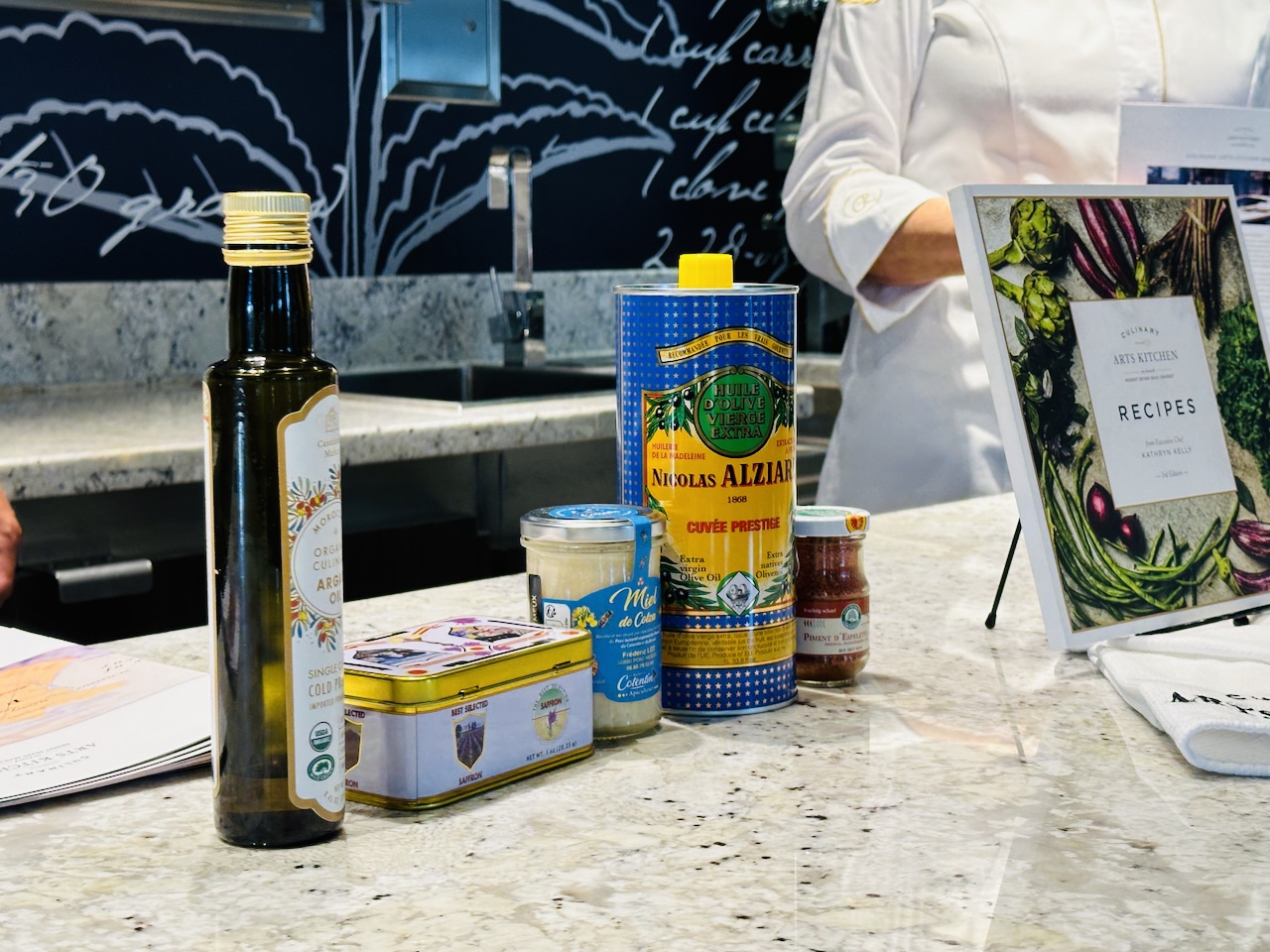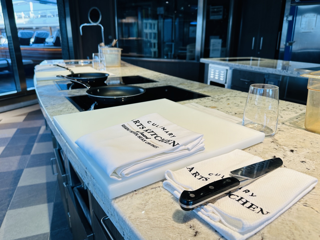 Aan boord mogen we plaatsnemen in het Culinary Arts Kitchen, een grote ruimte waar kookworkshops gegeven worden. Cruisepassagiers kunnen hier tegen betaling deelnemen aan kooklessen en in een paar uur tijd worden ze helemaal meegenomen in een bepaald thema. Ik zal ditmaal niet zelf koken, maar wél het creatieve brein achter deze kookworkshops ontmoeten, namelijk Kathryn Kelly. Samen met chefkok docent Karlis Celms praten ze ons bij over de workshops. Inmiddels is het aanbod vergroot ten opzichte van toen er gestart werd met deze workshops op de Seven Seas Explorer in 2017. Bij zusterrederij Oceania Cruises stond Kelly overigens al in 2011 aan de wieg van deze kookscholen.