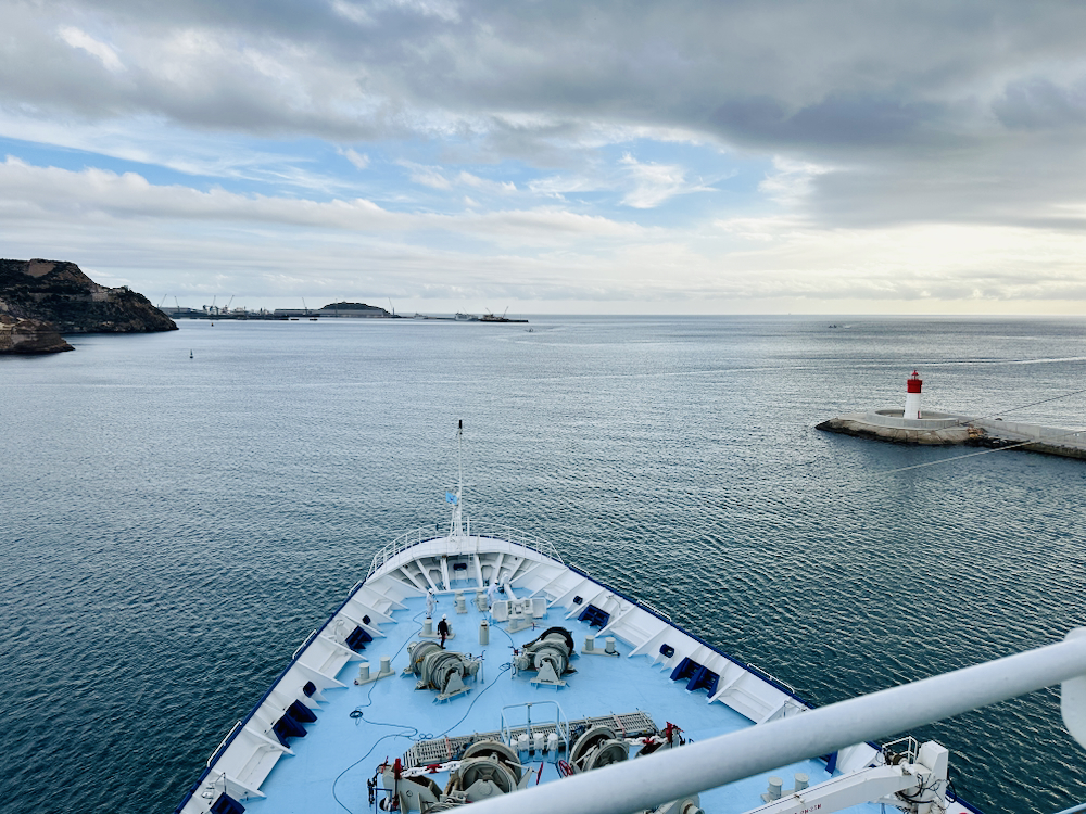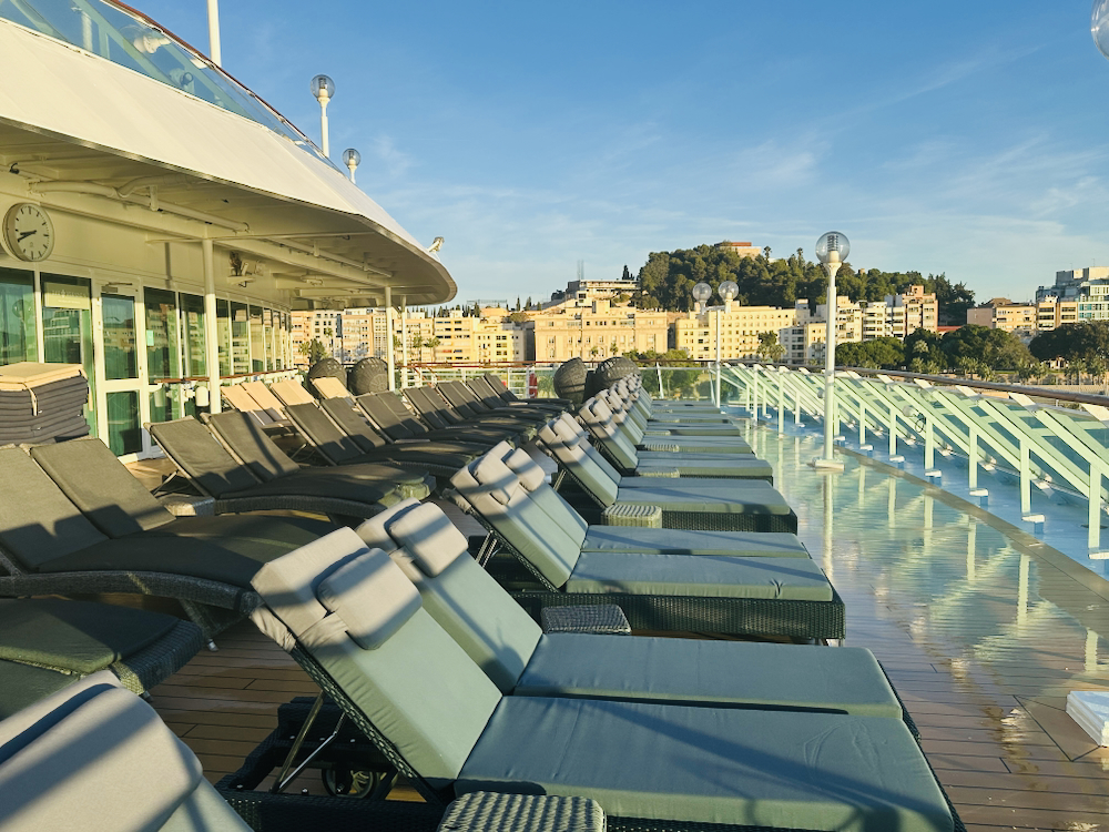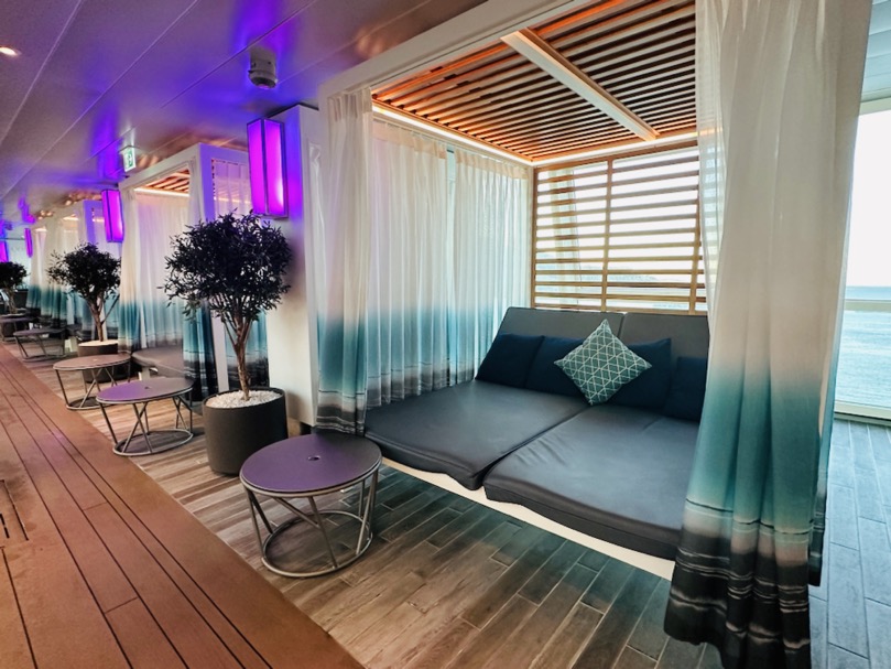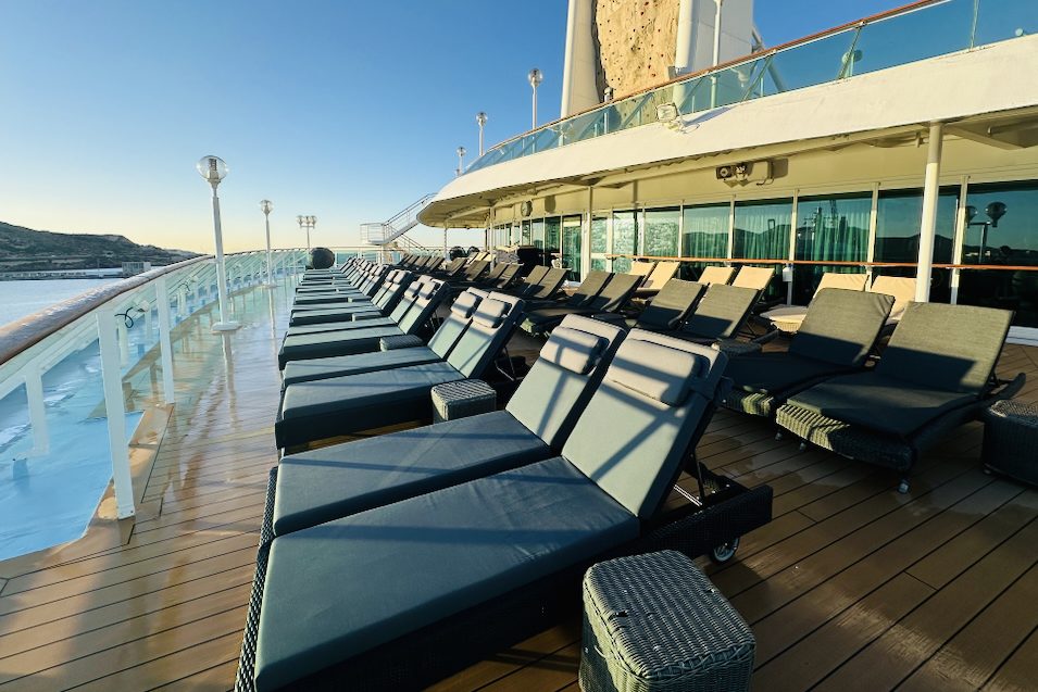 Behoorlijk verstopt is het zonnedek The Veranda. Dit is een adult-only zonnedek dat aan de achterkant van dek 9 gelegen is. Je bereikt het door op dek 10 achter een trap naar beneden te nemen, of op dek 9 door de fitness heen te gaan. Je komt er dus niet makkelijk. Ik zat er bijna elke morgen te genieten van mijn thee en de opkomende zon