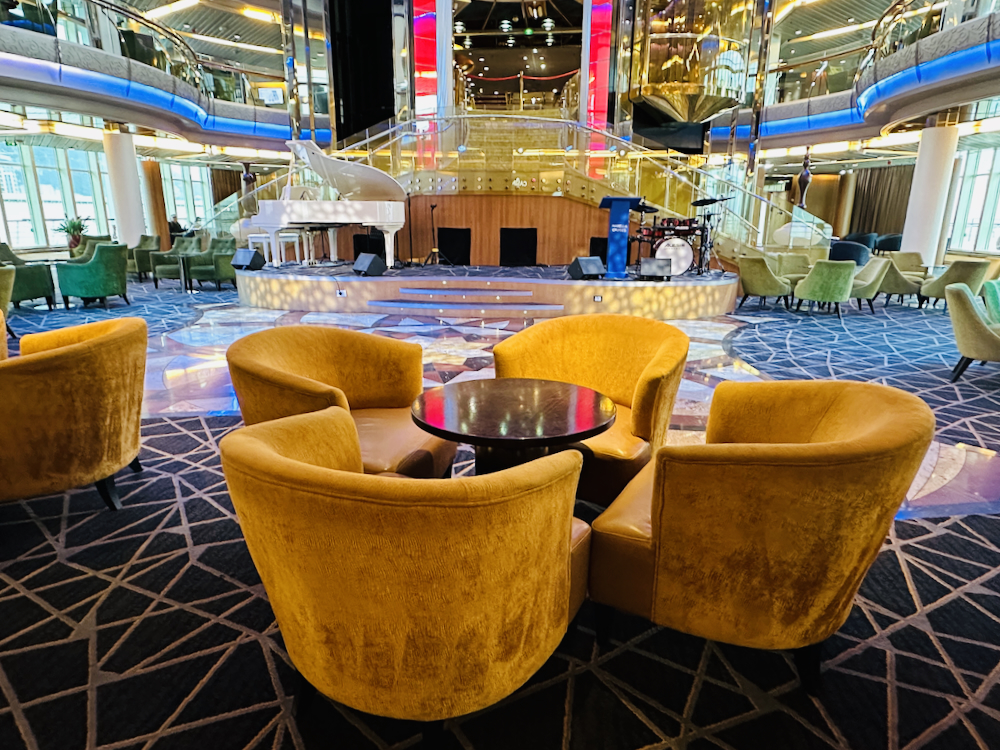 Het hoge Atrium is het hart van het schip. Overdag is het een ideale plek om te ontspannen met een kopje koffie of drankje van de (koffie)bar (toeslag, wel inclusief in het Premium drankpakket) en te genieten van het uitzicht op zee.