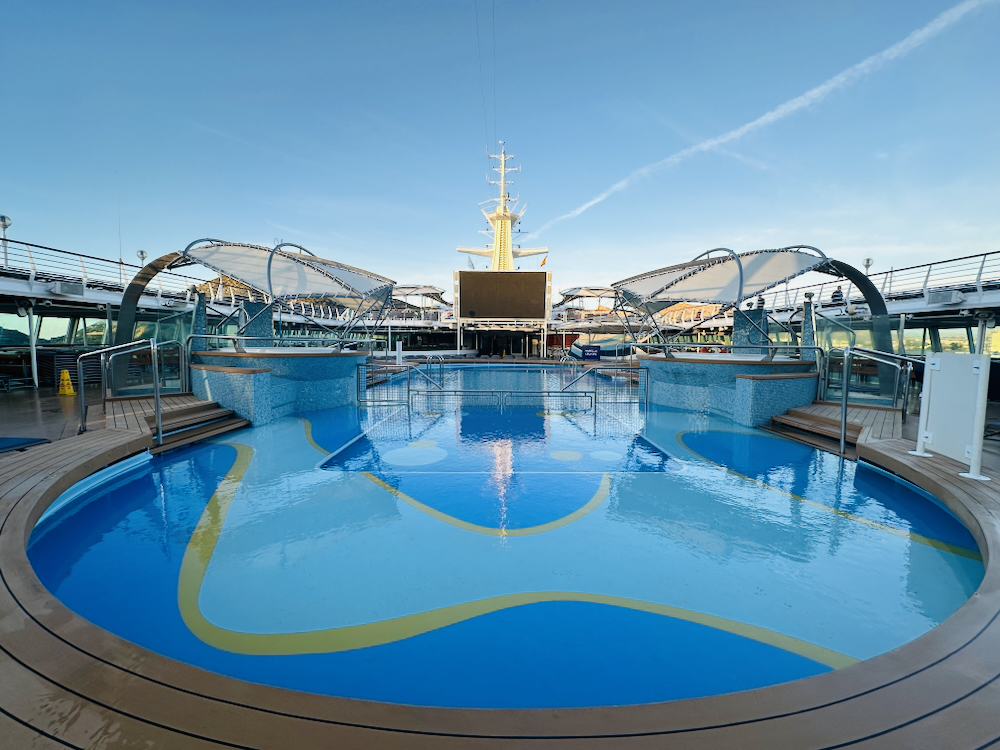 Het buitenzwembad heeft twee whirlpools, een dieper zwemgedeelte en een gedeelte met laag water, voor kleinere kinderen. Rondom het zwembad staan veel ligbedden en eromheen ligt een hoger dek waar ook ligbedden opgesteld zijn. Aardig is dat er op het grote filmscherm een verzoek staat dat je geen ligbedden bezet mag houden, hooguit om binnen 45 minuten even wat te eten, in bijvoorbeeld het nabijgelegen buffetrestaurant of de Snack Shack (salade, sandwich of frites) op het zwembaddek. In de middag is er rustige muziek en wordt er regelmatig wat georganiseerd. Tussen 12 en 2 is het wel -bewust- stil, om de zon aanbidders die van stilte houden ook tegemoet te komen.