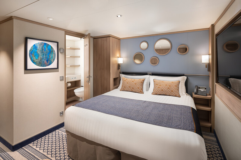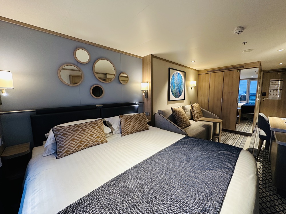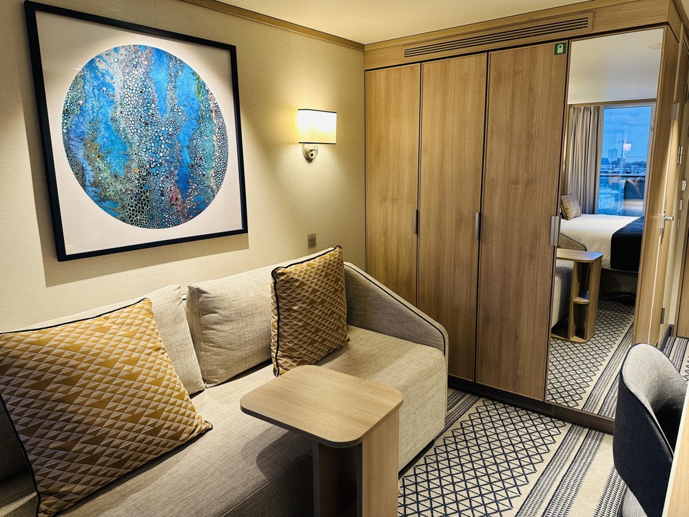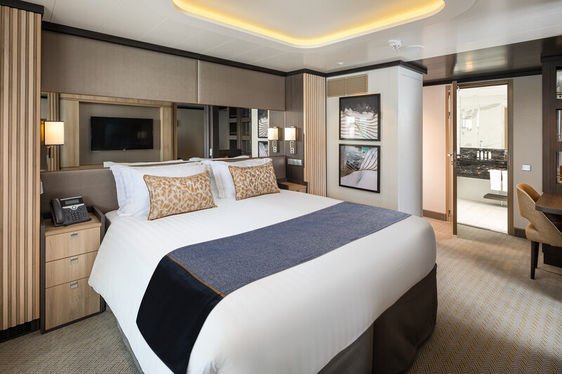 Aan boord van de Iona vind je op dek 8 (achter) en dek 9 hutten met een binnenterras én een balkon, de conservatory minisuites geheten. Met champagne en chocola word je welkom geheten in deze suite die 23 m2 groot is.