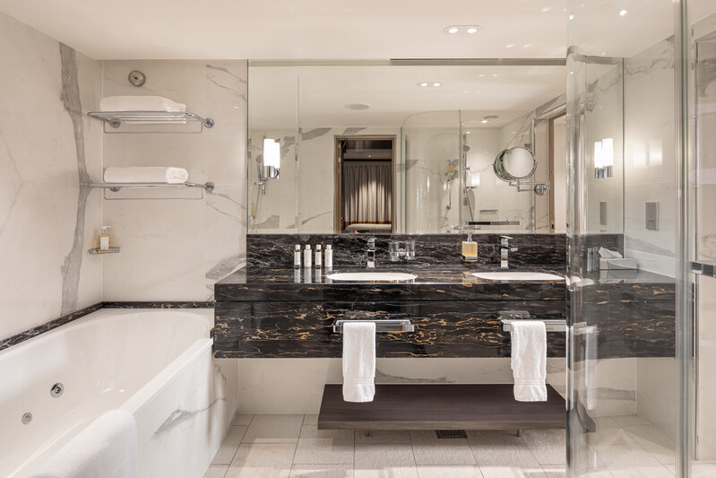 Je hebt een masterbedroom, een woonkamer, walk in closet, badkamer met apart toilet en balkon rondom de suite.