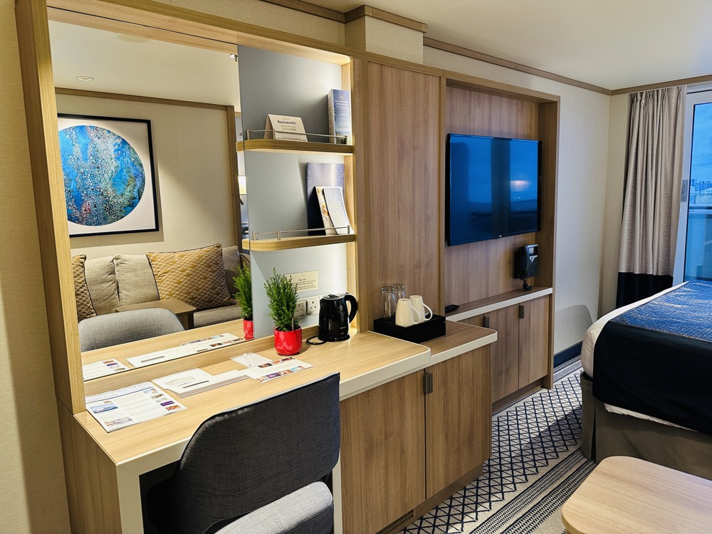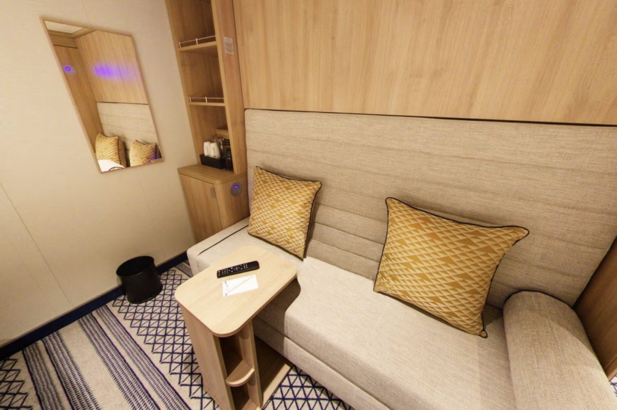 Het bankje fungeert als slaapbank voor de 3e persoon. Tegenover het bed hangt een grote tv met daarop Britse kanalen, zijn er videos aankiesbaar, series en is er een kanaal met webcam van het schip. Je hoort overigens P&O Cruises Radio als achtergrond bij de webcam, met aangename liedjes en reclames van de rederij.