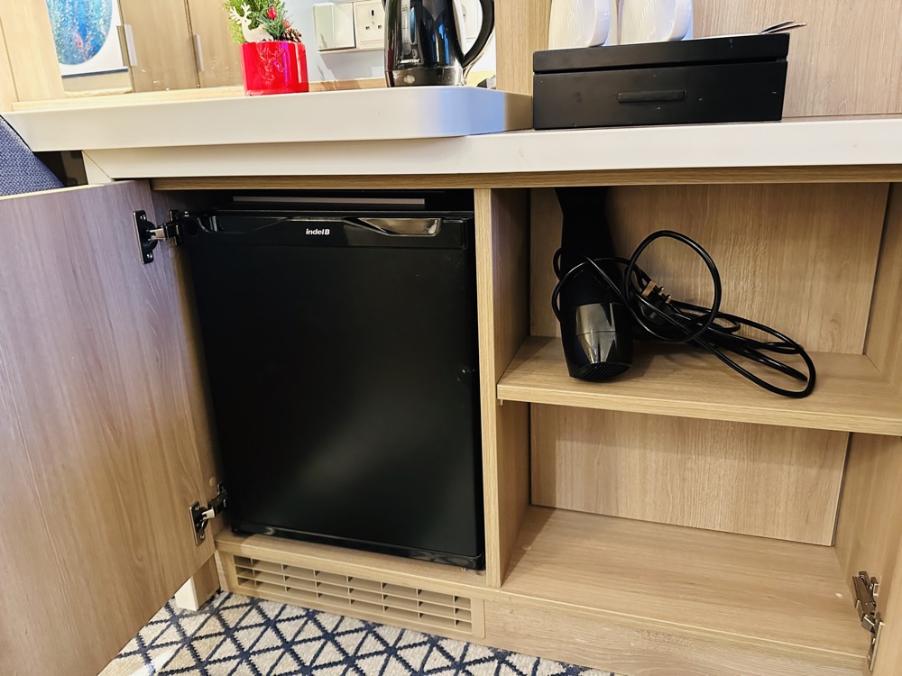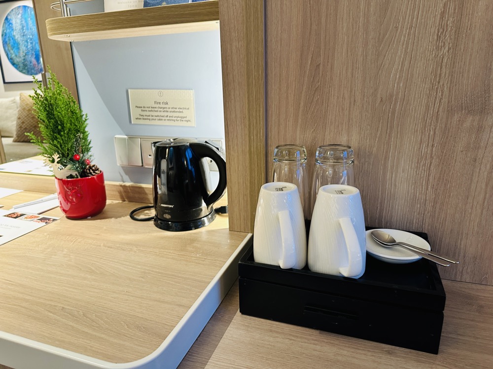 Tot de standaard faciliteiten van elke hut behoren onder andere een waterkoker met koffie/thee benodigdheden. Zo fijn! Goed om te weten is dat er voornamelijk Britse stopcontacten zijn en 1 Europees. Neem dus verloopstekkers mee! Daarnaast is er naast het bed ook een usb poort om apparatuur op te laden.