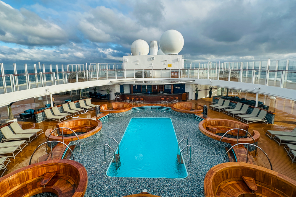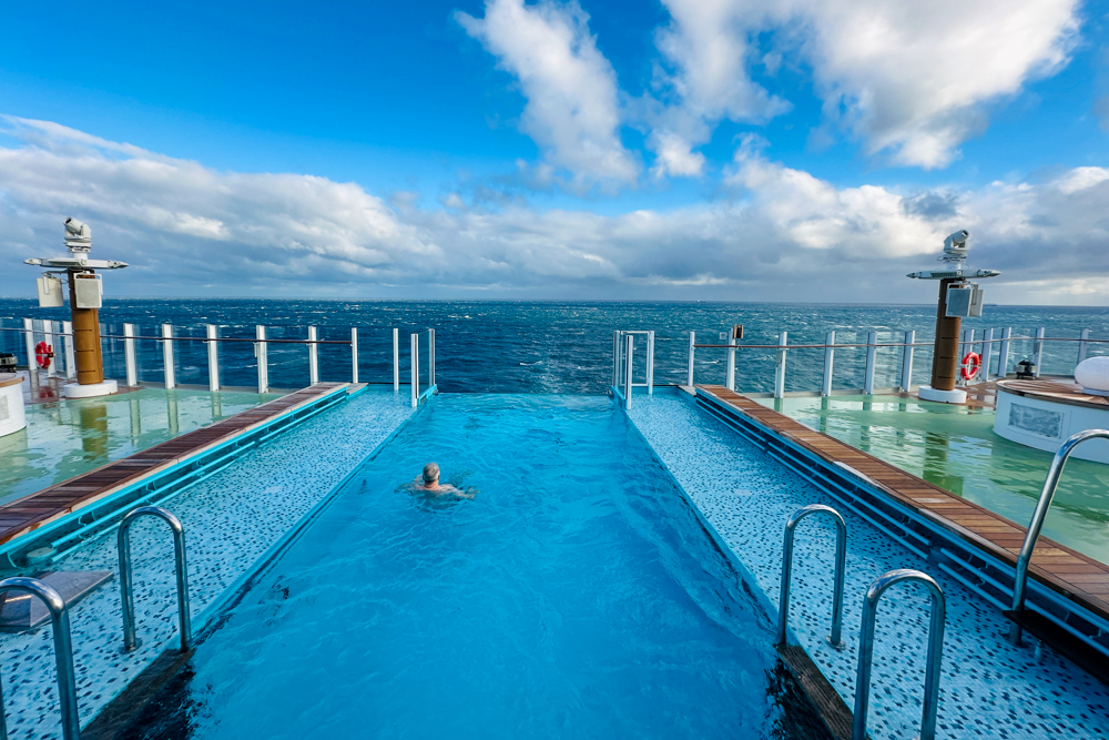 Tijdens mijn cruise in december was het niet heel warm buiten, maar waren er altijd mensen in één van de twee infinity zwembaden. Brr! Toegegeven, ze zien er geweldig uit! Vooral tijdens het varen heb je een magnifiek uitzicht, vooral in het ‘laagste’ zwembad. Hierbij ook gelijk een tip voor een drankje met fantastisch uitzicht: ga hiervoor naar dek 8 achter. Met mooi weer (helaas niet tijdens mijn cruise) is dit de plek om te zitten. Er zijn twee whirlpools en een bar op een fenomenale plek.