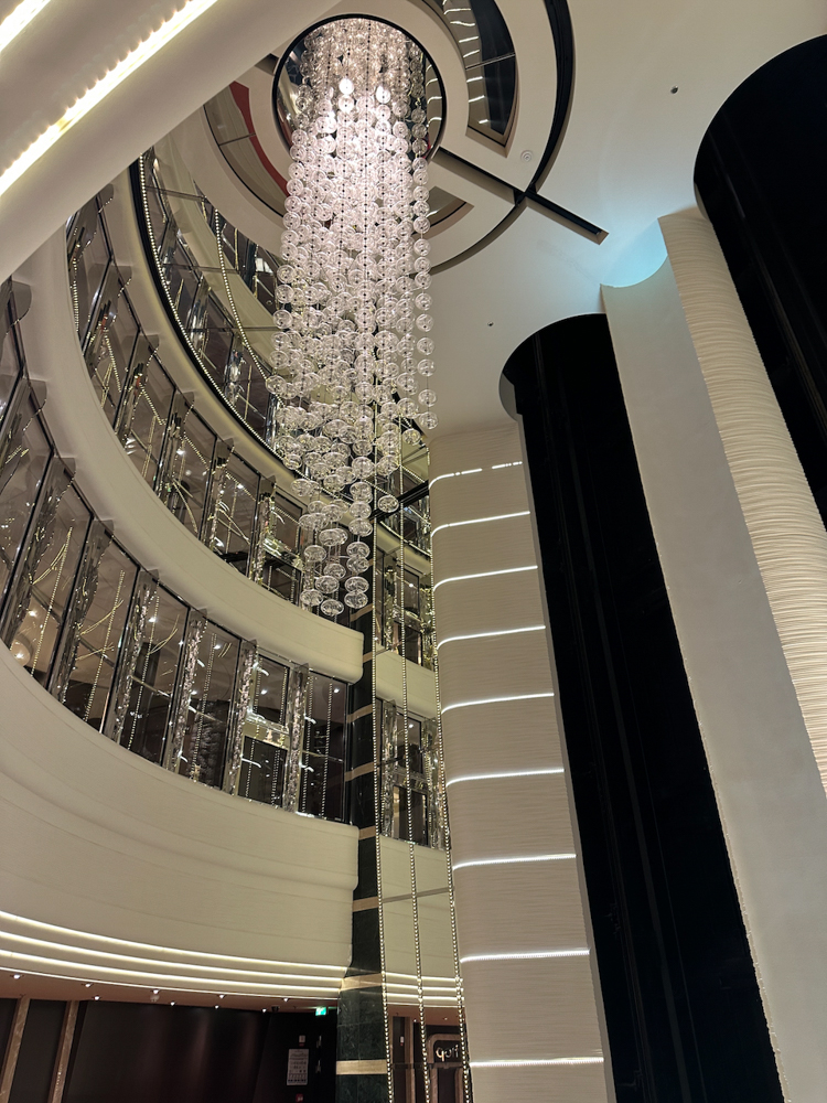 De binnenkomst is groots, in het atrium met haar kristallen trappen en indrukwekkende troonluchter. Het is in de ochtend nog wat stil, maar later na de lunch, bruist het atrium en hebben veel mensen een lekkere zitplek opgezocht.