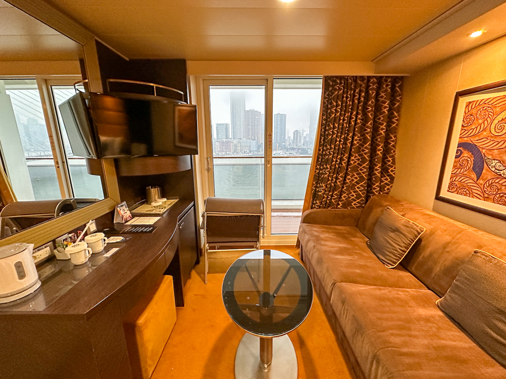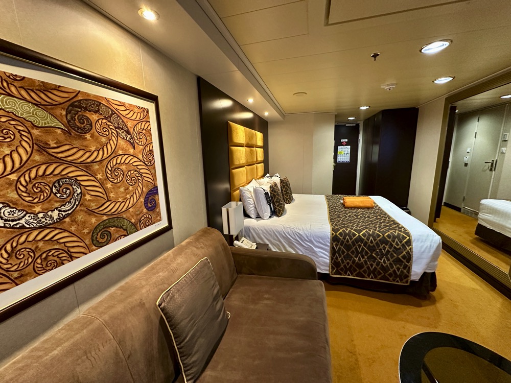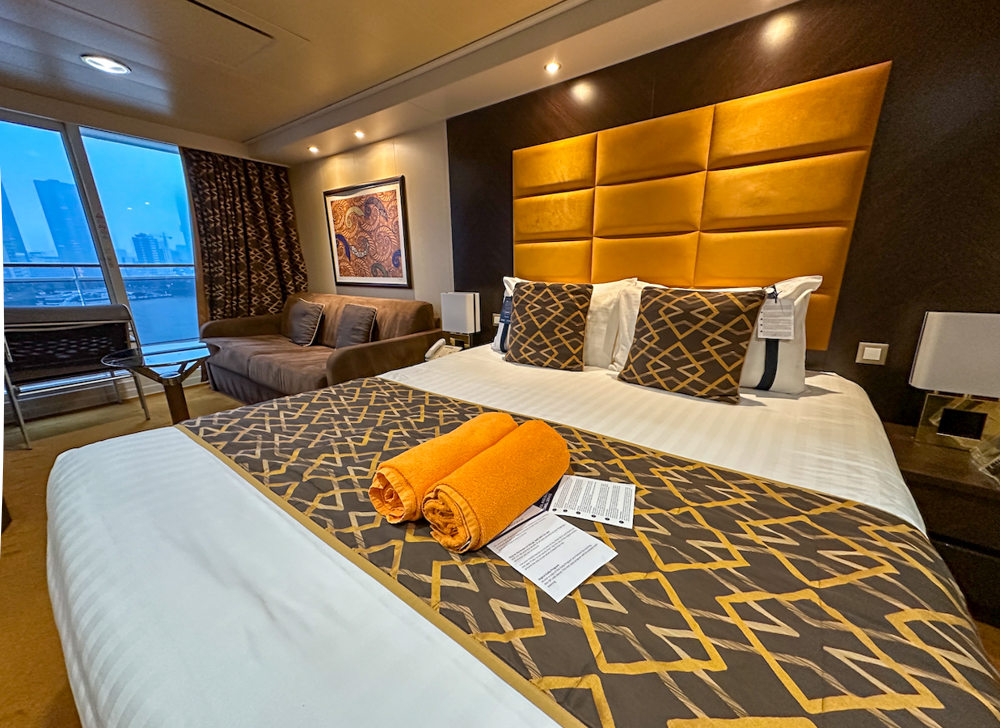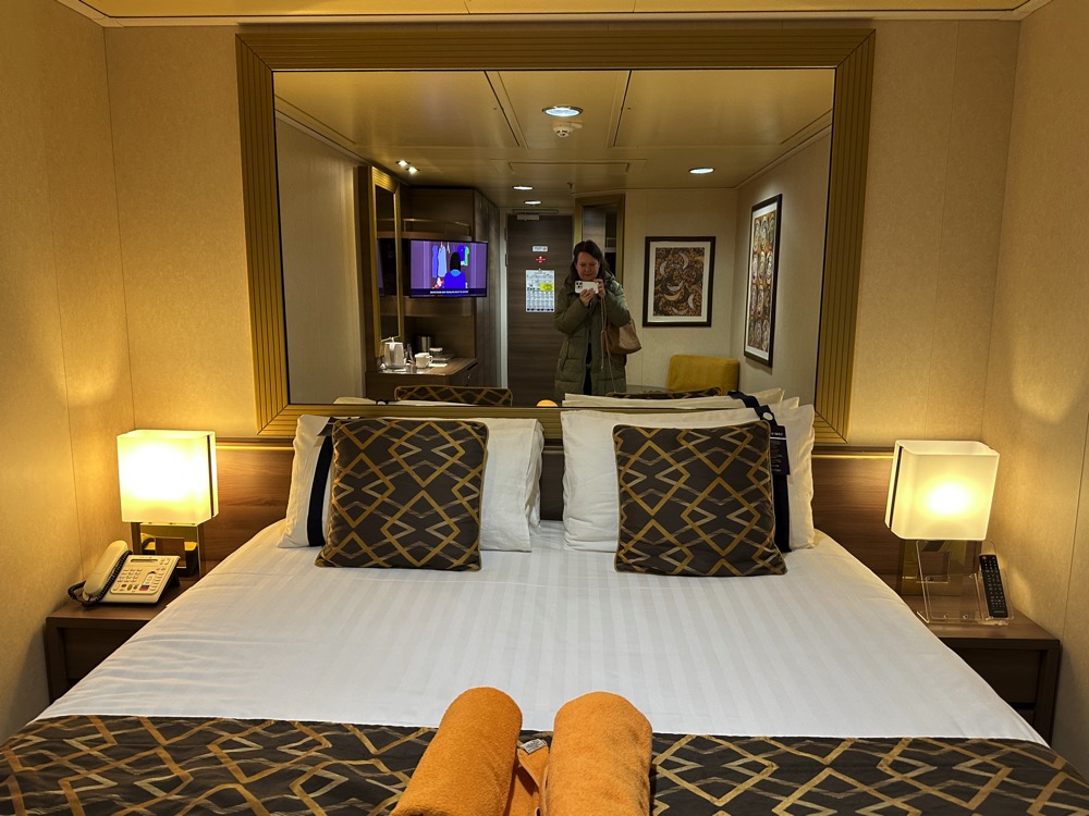 Aan boord mocht ik een kijkje nemen in twee hutten: een balkonhut en een verrassend ruime binnenhut. Er zijn meer dan 1100 balkonhutten die op dit schip een geel/bruin of rood/bruin interieur hebben.