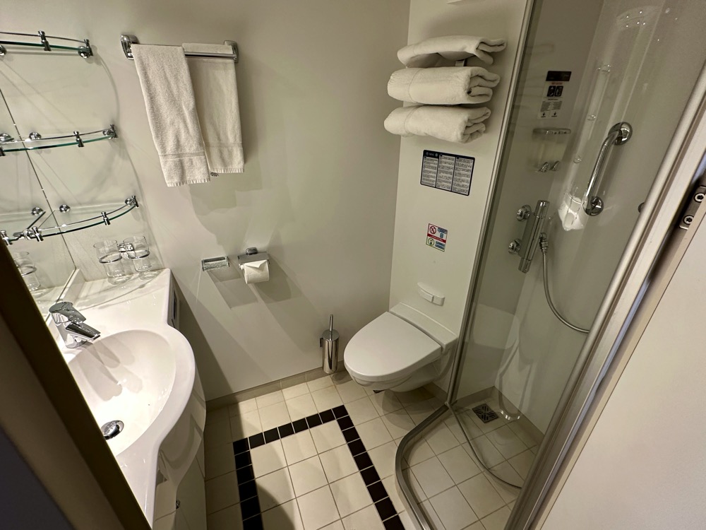 Ik was bijzonder verrast door de ruime binnenhut die ik mocht bezoeken, nr 13005. Vooral het feit dat je een tafeltje met kleine sofa hebt, is mooi. Aan de andere kant heb je dat ook wel (minimaal) nodig als je met 4 personen in deze hut zit. De twee extra personen slapen in bedden die uit het plafond neergeklapt worden, door je kamersteward.