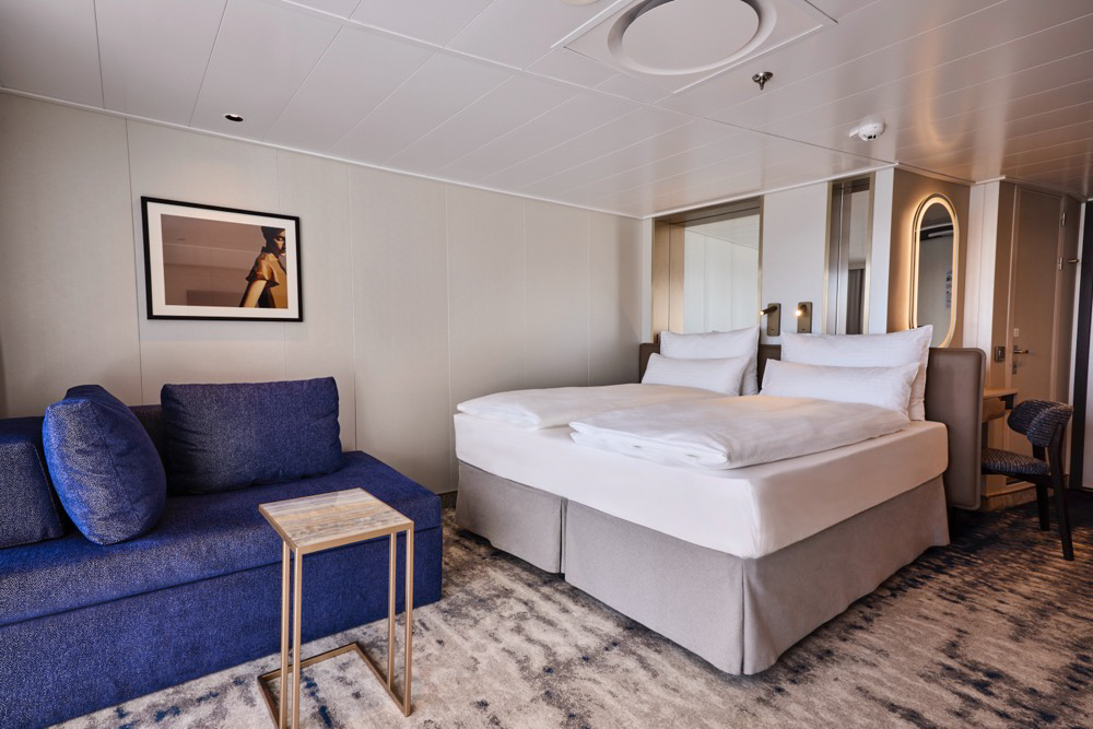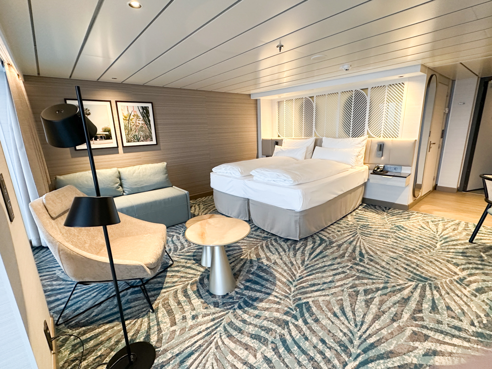 Aan boord van de Mein Schiff Relax zijn 6 soorten suites beschikbaar, waarbij (vanaf de categorie Fernweh Suites) ook aparte woon- en slaapgedeeltes gecreëerd zijn.