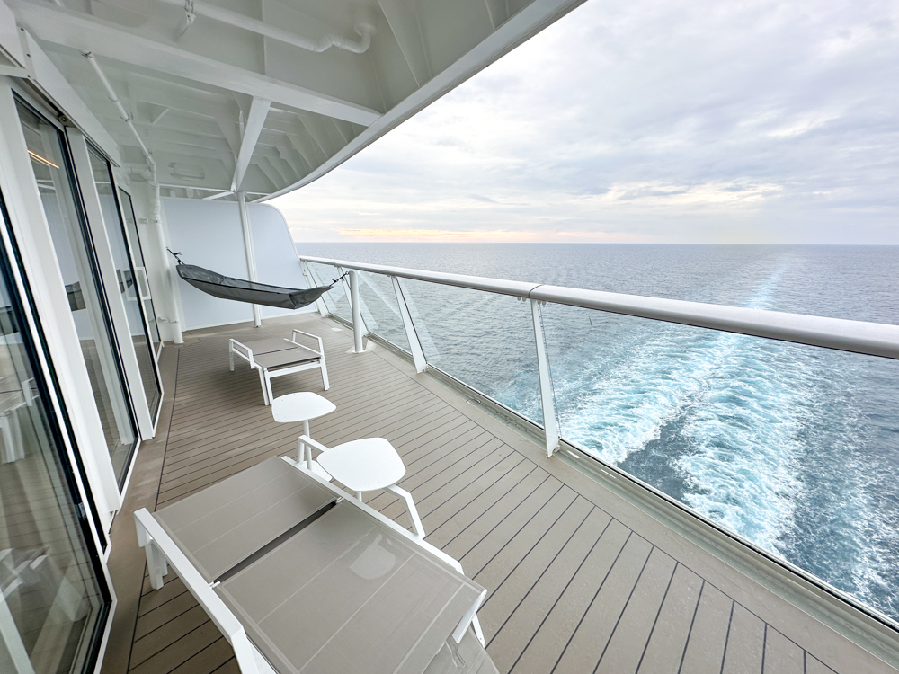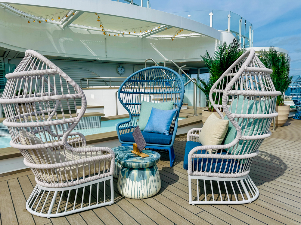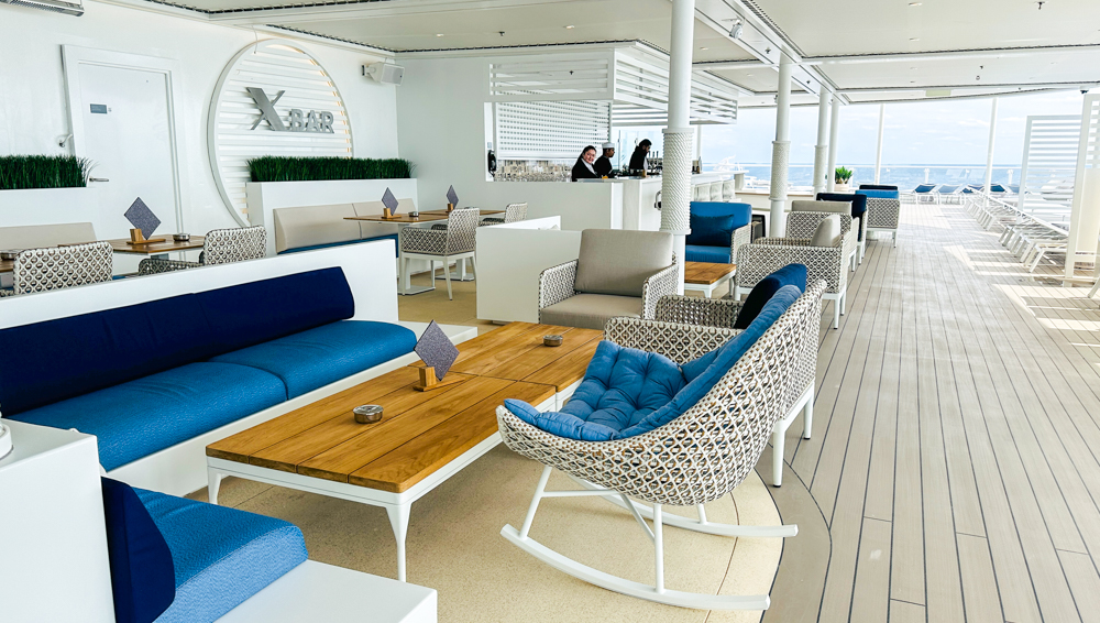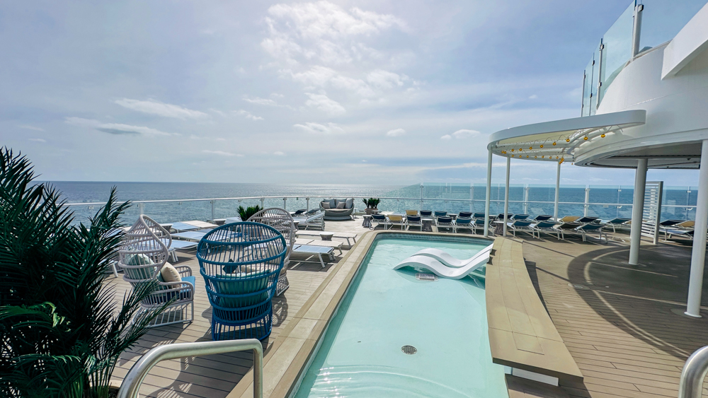 Het buitendek op dek 16 is de plek waar suitegasten gebruik kunnen maken van ligbedden, de X-bar en waterpartijen. Er staan wat fijne zitjes, schommelstoelen en veel ligbedden. Deze zijn overigens wel hetzelfde als op de rest van het schip.