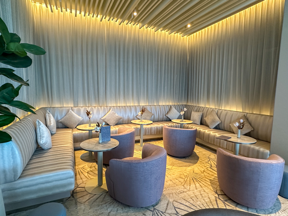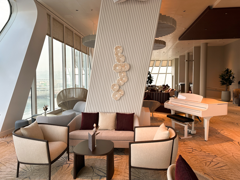 De lounge ligt prachtig gelegen aan de achterkant van het schip. Glazen ramen van vloer tot plafond zorgen voor een heerlijk uitzicht. Binnen in de lounge geniet je van gratis drankjes, champagne en de service van concierge. Buiten vind je rondom een buitendek met lounge sets en diverse zitjes.