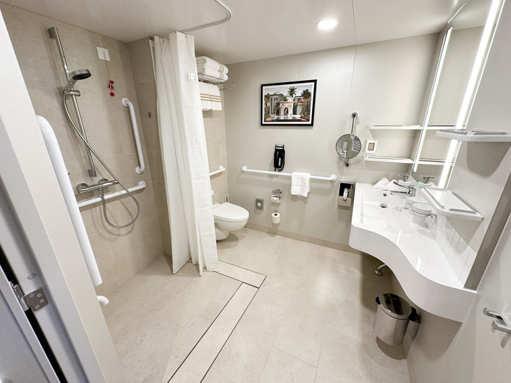 De toegankelijke juniorsuites (4 stuks) hebben een aangepaste badkamer en een gemakkelijke toegang tot het balkon (drempelloos). Daarnaast zijn enkele faciliteiten handiger geplaatst: stopcontacten en een airconditioning met een schuifje.