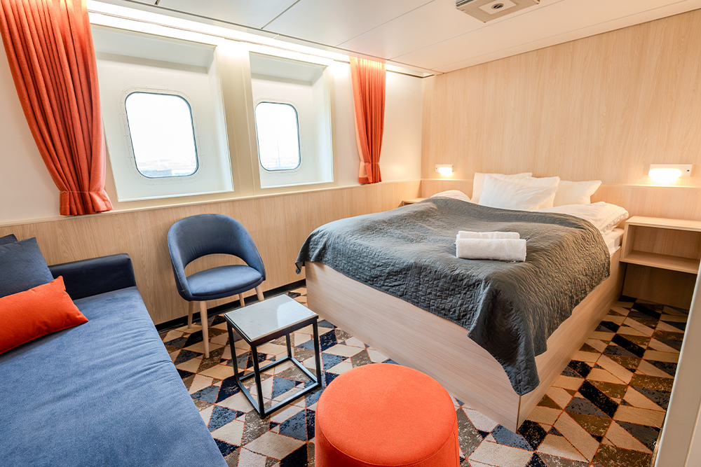 Nog een categorie hoger zijn de Commodore hutten beschikbaar. Deze premium hutten hebben uiteraard uitzicht op zee, gratis ontbijt en een gratis minibar. Er kunnen 4 personen in deze hut en extra is de stewardservice.