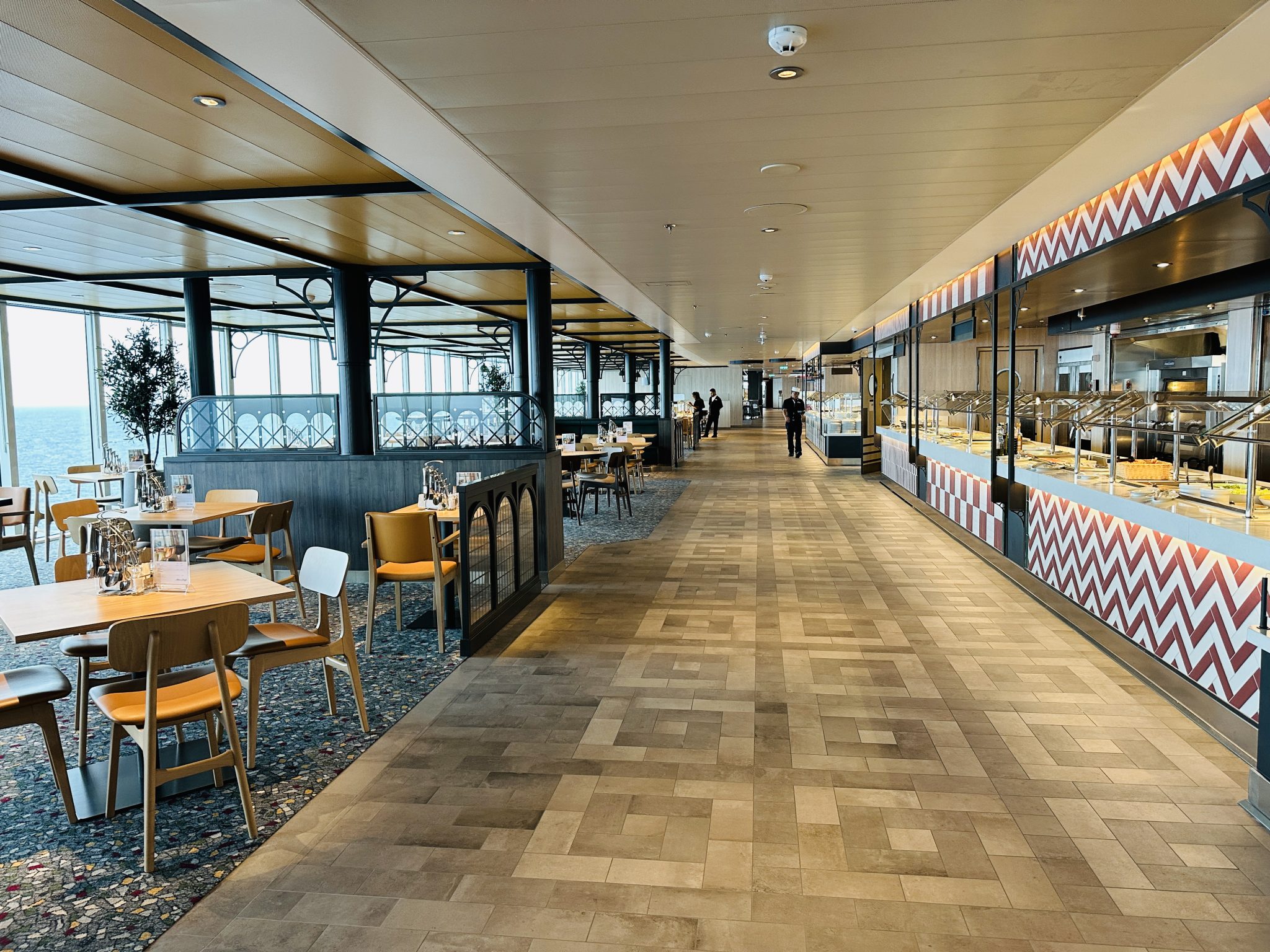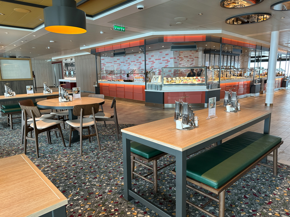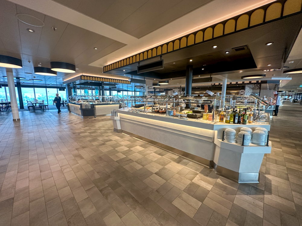 Er is voor ieder wat wils Aan beide kanten van het restaurant is veel plek aan de ramen om te zitten. Opvallend fijn is dat de tafels niet te dicht op elkaar staan! Ondanks dat er veel mensen terecht kunnen, geeft het een rustig gevoel. Bij mooi weer kan je er ook voor kiezen om bij de Agora (een zonnedek/zwembad gedeelte) buiten te gaan zitten. De tafels zijn hier overkapt. Tijdens de openingstijden van Harbour market kan bovendien altijd koffie/thee, wijn, bier en allerlei softdrinks en sapjes halen bij de zelftap-automaten. Waar dit restaurant bovendien ook om bekend staat is de bakkerij, met allerlei soorten brood, waaronder ook het rustieke Mein Schiff brood.