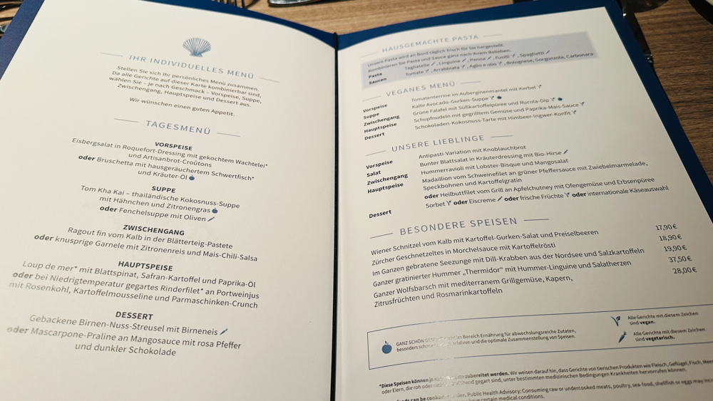 Ik was blij verrast op de Mein Schiff Relax door het grote aanbod van restaurants die inclusief in de prijs zijn! Op elke menukaart staan overigens wel 1 of 2 items die voor een toeslag verkrijgbaar zijn. Dan heb je het bijvoorbeeld over de wat exclusievere producten zoals kreeft, kaviaar of bepaalde vissoorten. Heb je dit er niet voor over, dan heb je zeker nog wel een gedenkwaardige lunch of diner! Goed om te weten is dat de porties bij TUI Cruises niet extreem groot zijn, waardoor je enerzijds veel gangen kunt uitproberen en anderzijds niet zo snel met een te vol gevoel van tafel gaat.