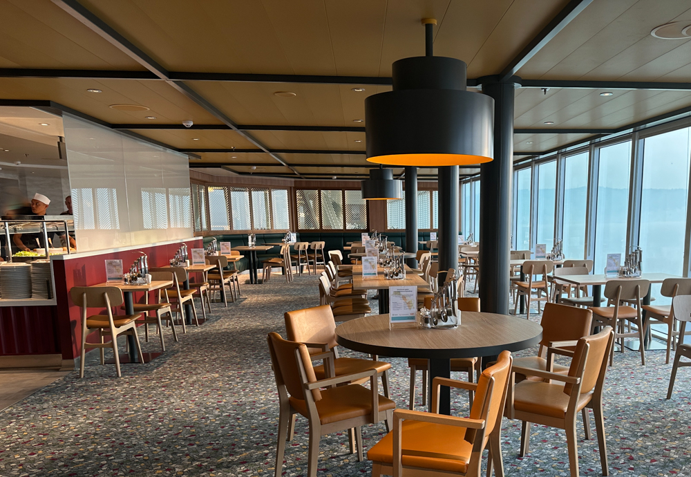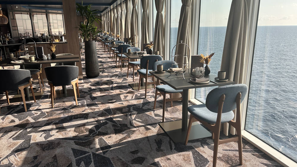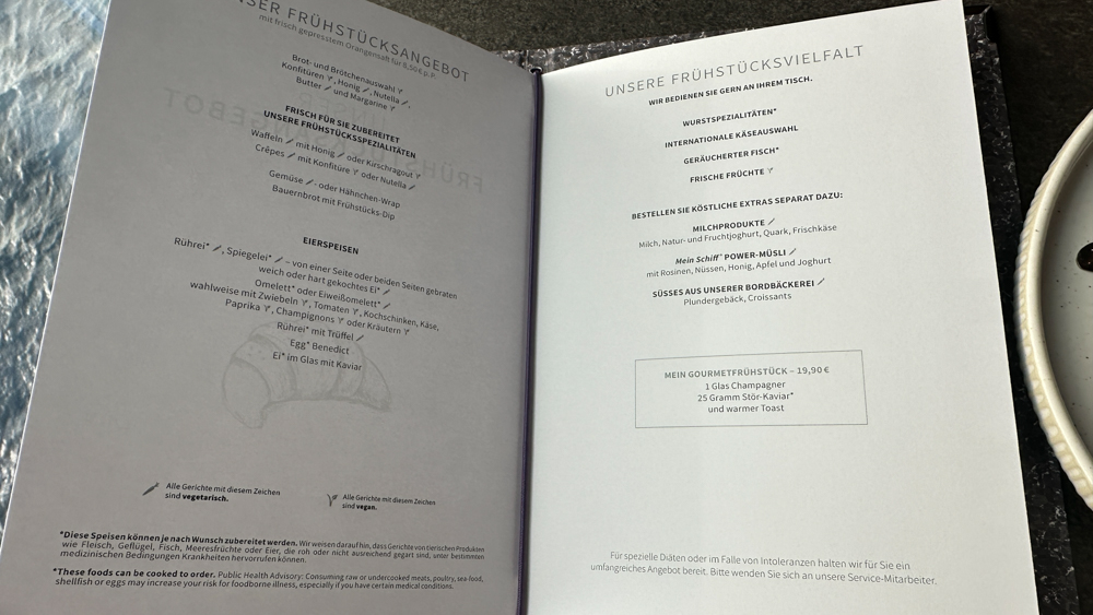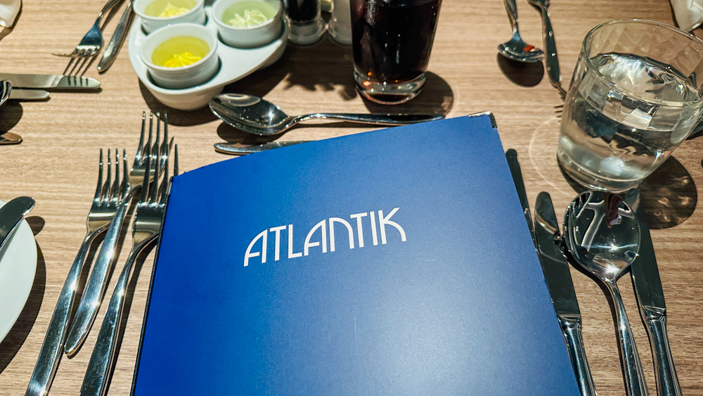 Aan de achterkant van het schip ligt hoofdrestaurant Atlantik. Voor de rederij is het de eerste maal dat deze achteraan geplaatst is. Met een groots uitzicht kan je hier ’s ochtends ontbijten. Er is een buffetgedeelte geopeend met vleeswaar, vis, een broodjes wand en yoghurtspecialiteiten. Daarnaast is er een kleine kaart voor ei-gerechten. Je wordt aan tafel bediend voor koffie en thee.