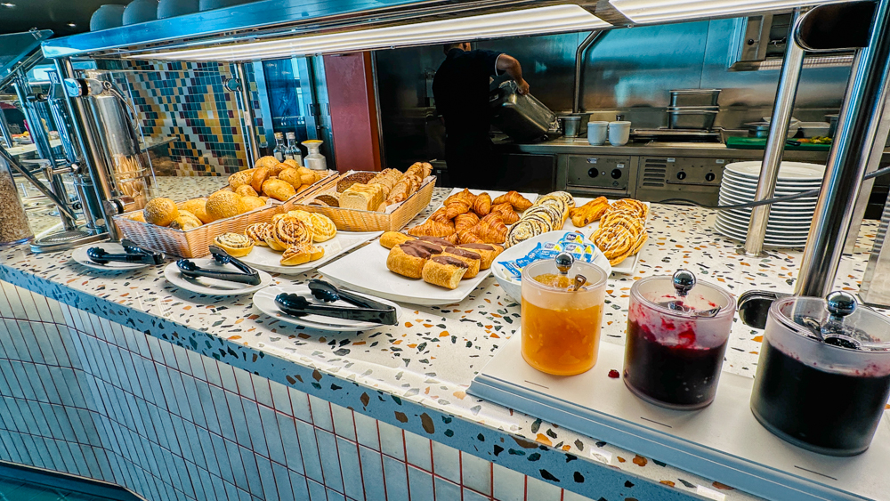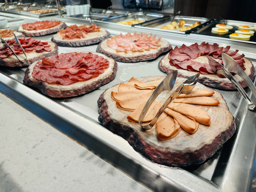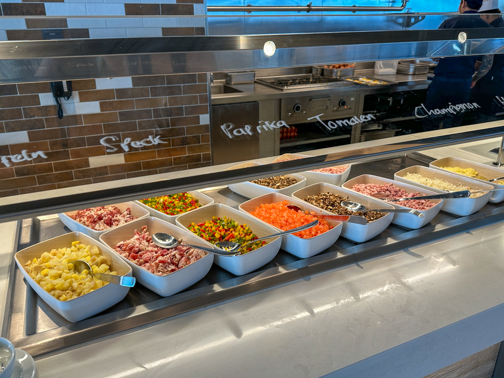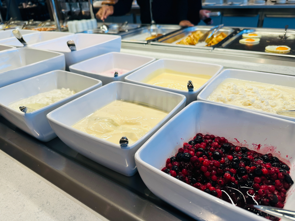 Het steakrestaurant Hofde is het enige restaurant waarvoor je voor het ontbijt een toeslag betaalt (€8,50), overigens wel een schappelijke toeslag 😊 De versgeperste jus is bij de prijs inbegrepen. Bij het ontbijt ontvang je een gevulde etagère op je tafel en zijn er diverse gerechten die je kunt bestellen, zoals wafels, crepes of zelfs een wrap. Ook zijn er uiteraard ei-gerechten, waarvan de ei in een glaasje met kaviaar ongetwijfeld de meest populaire gaat worden. Wil je een champagne met steur kaviaar dan betaal je daarvoor €19,90 bij.