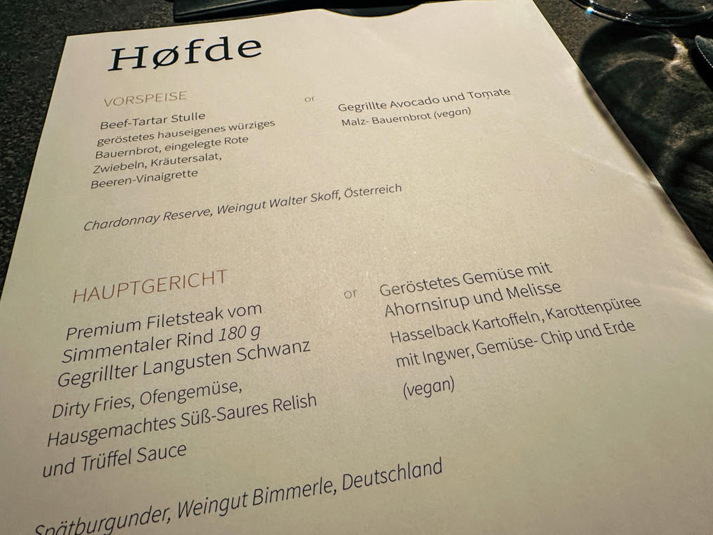 Wil je een avondje uit, dan raad ik je de Franse Bistro aan (wel inbegrepen in de prijs). Een betaalde optie is in steakhouse Høfde, dat overigens in het Deens ‘huis’ betekent. In Høfde zit je in een gezellige ambience en naar wens met zicht op de open keuken.